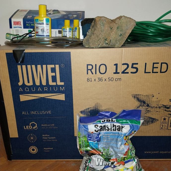 Prodajem novi akvarij juwel 125l za 250eura.Uz akvarij ide filter,pumpa,grijač,crijevo,dekorativni kamen,dekorativni šljunak,tablete za uklanjanje algi,sredstvo za pripremu akvarijske vode,sredstvo za razbistravanje vode.