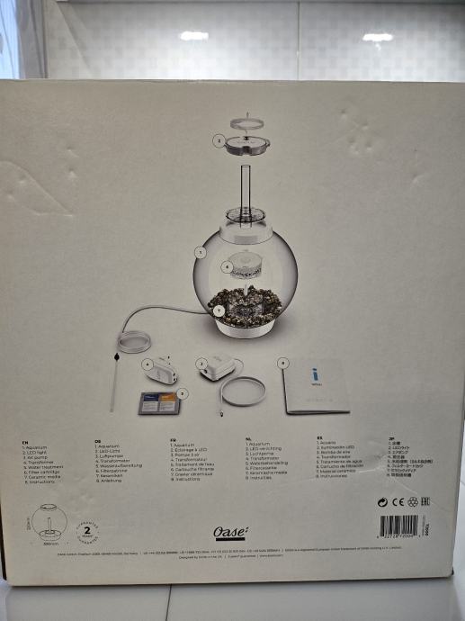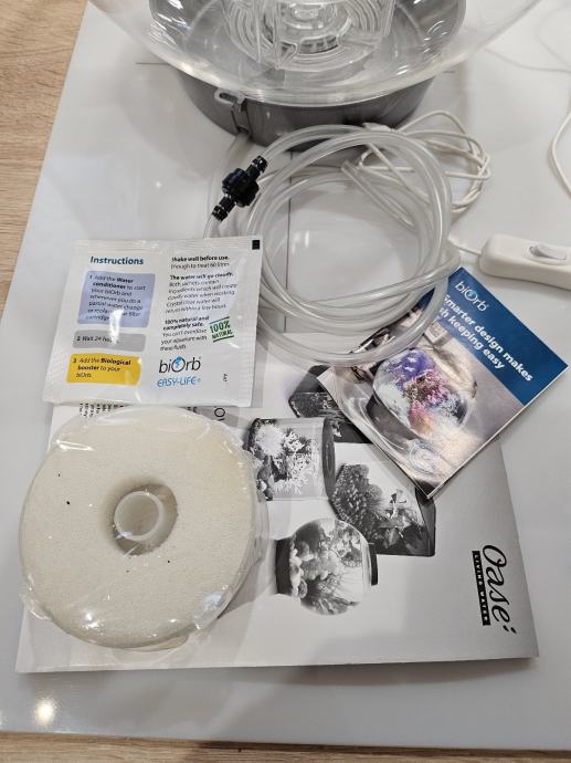 Akvarij, zračna pumpa, LED rasvjeta, transformator, uređaji za obradu vode, zračni kamen, filter uložak, keramički materijal i upute za uporabu