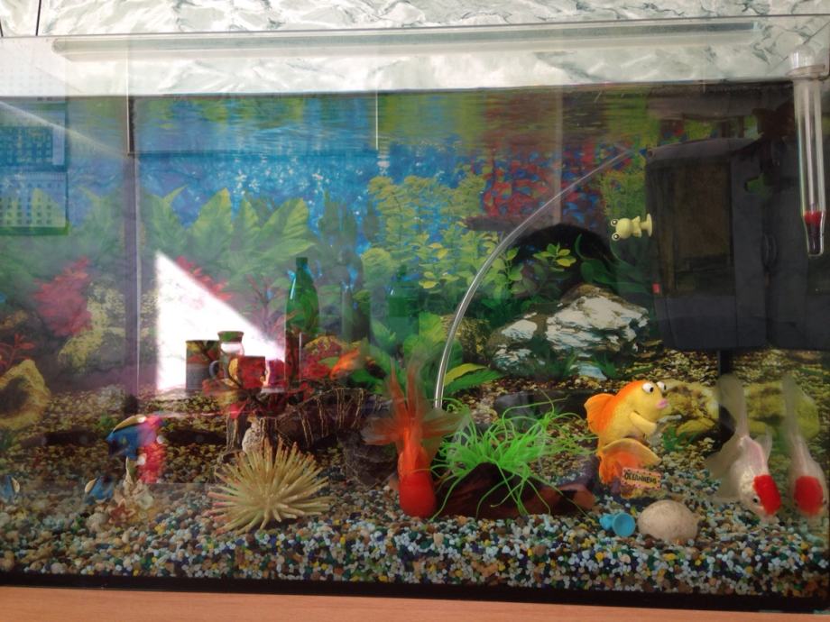 Most+2 umjetne biljke+2 umjetna koralja+umjetne ribice+ukrasna tapeta+kamenčiči za podlogu u više boja+termometar+magnet za ćišćenje stakla+više vrsta hrane+sredstva za pripremu vode kada se mjenja voda i drvo Afrićko koje je predviđeno za akvarije i TD.