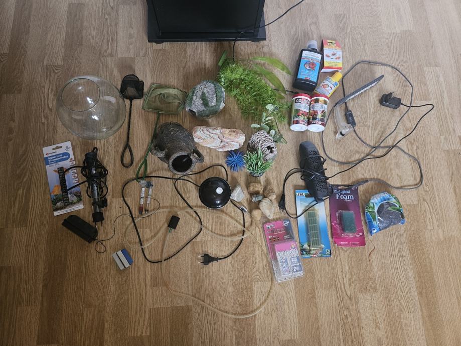 U kompletu dolaze dva filtera, grijač, uređaj za unos kisika, hrana, razni ukrasi i ostalo. Također, u kompletu ide i crno drveno postolje koje je na slikama.