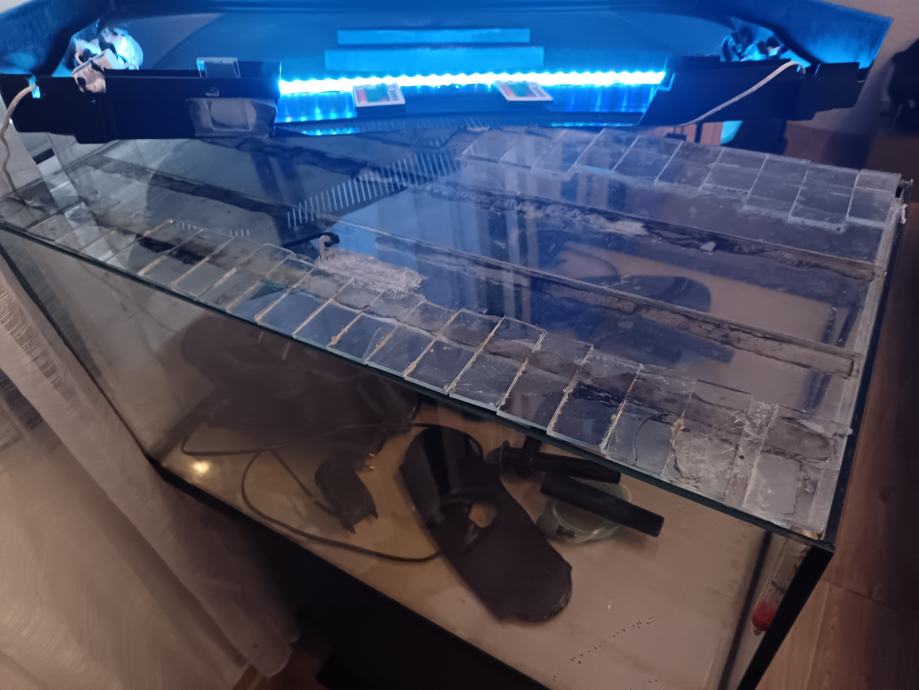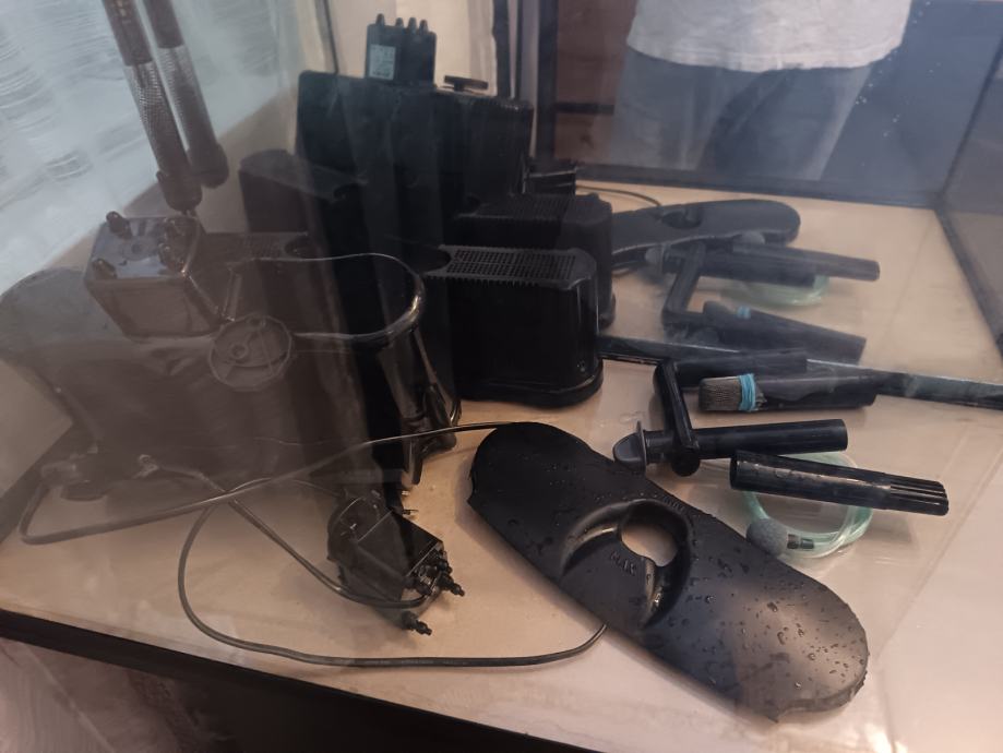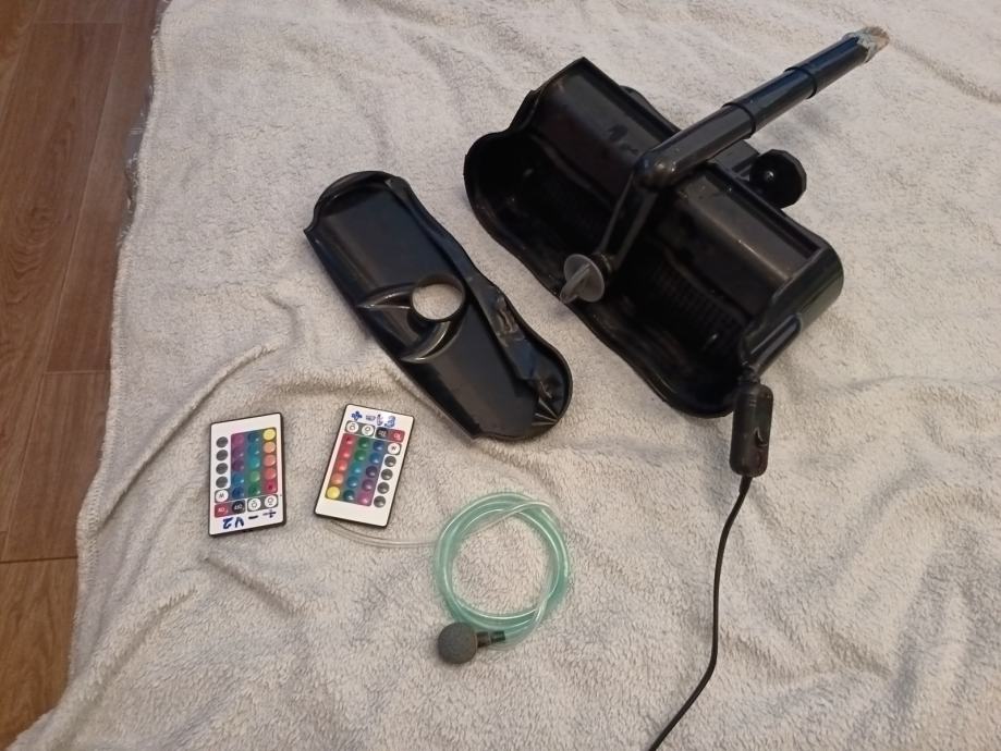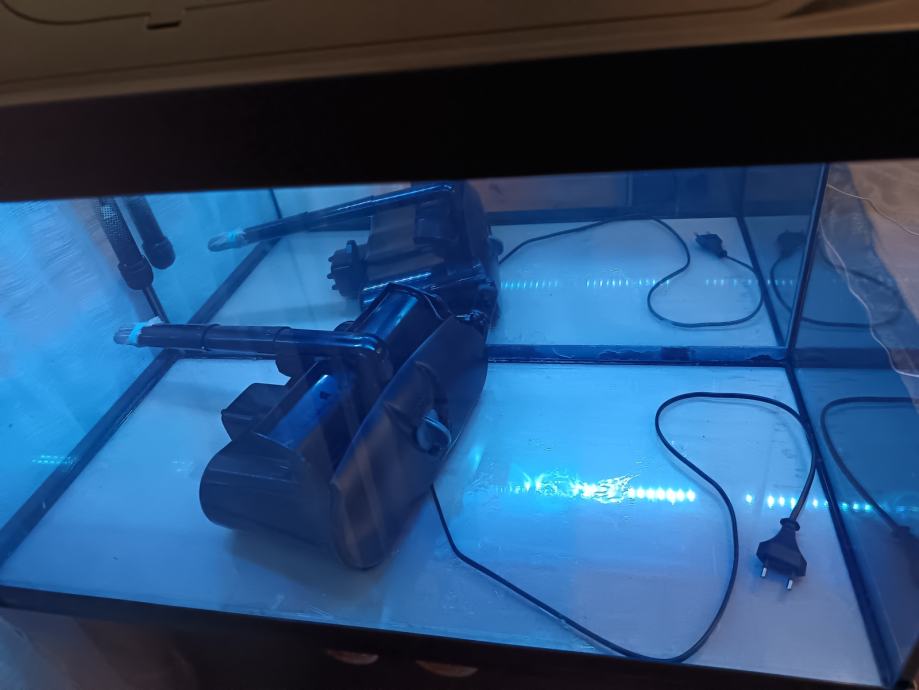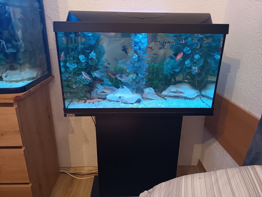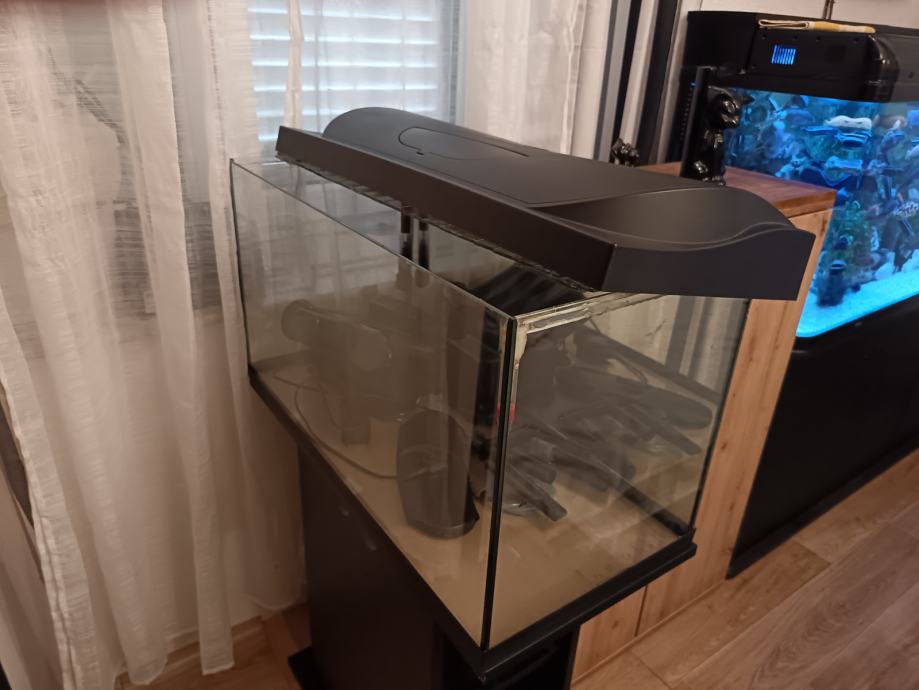 Prodajem akvarij rabljen svega nekoliko mjeseci, original Tetra (Njemačka), sa original Tetra postoljem, nadokupljenim vanjskim visećim (hang on) filterom Aquael (Poljska)-vodena pumpa snage 9,8 W, protoka 1200 litara/sat, grijačem 50w, raspršivačem za zrak, termometrom, nadograđenom dvostrukom Led RGB rasvjetom sa kontrolerima i daljinskim upravljačima (rasvjeta je hermetički zatvorena). Nadograđen je i stakleni dodatni poklopac akvarija (nema isparavanja ni bilo kakvih mirisa).