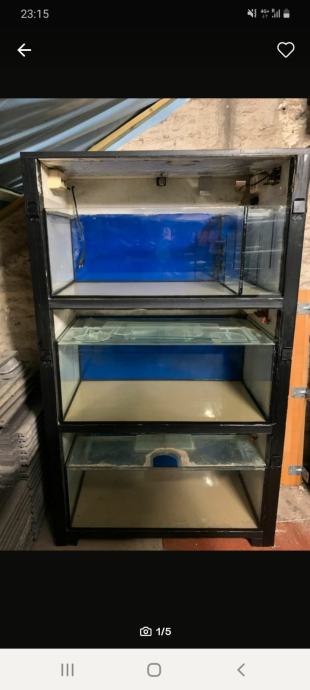 Prodajem akvarij X6, radi se o sustavu s više akvarijskih posuda postavljenih u drvenom ormaru/stalku crne boje. Stalak je masivne konstrukcije i nudi nekoliko razina na kojima su smješteni stakleni akvariji. Jedan od akvarija ima plavu pozadinu i osvjetljenje, a ostali su bez dodatne opreme. Sve staklene ploče su neoštećene. Stalak s akvarijima dolazi kao cjelina, što je praktično za uzgoj više vrsta ili odvajanje različitih jedinki.