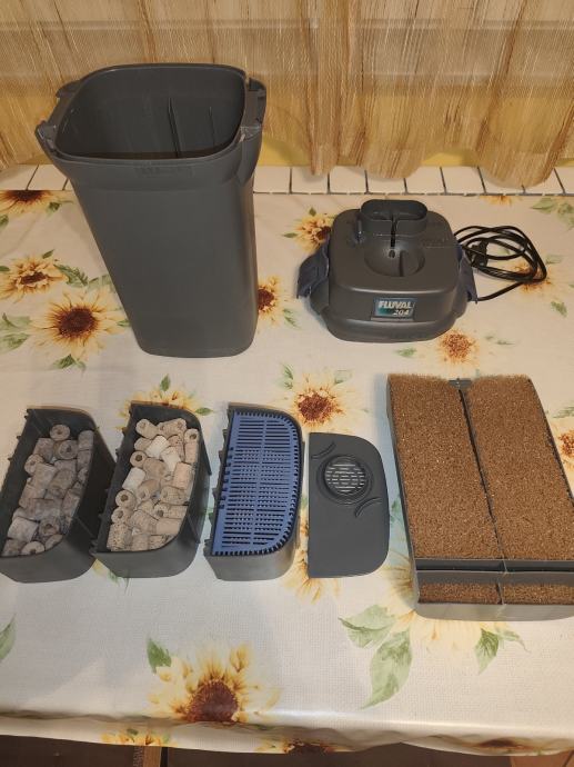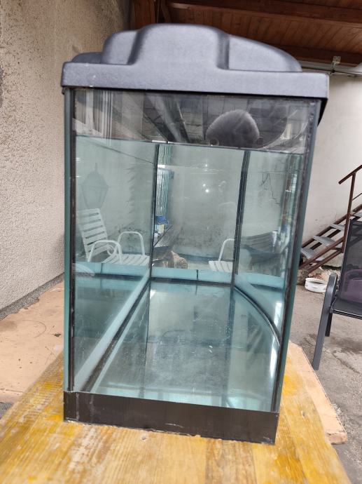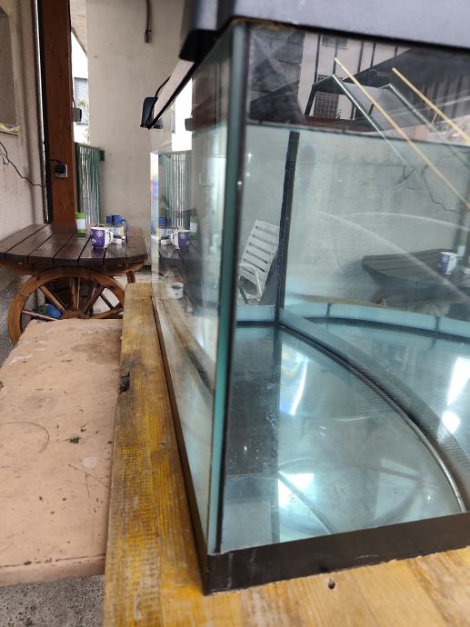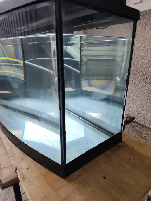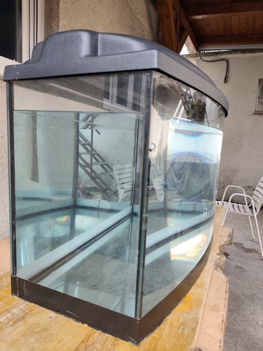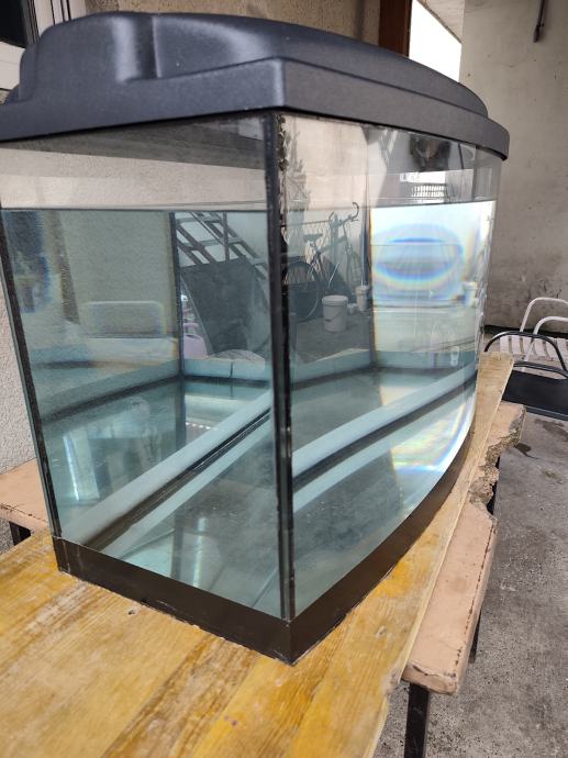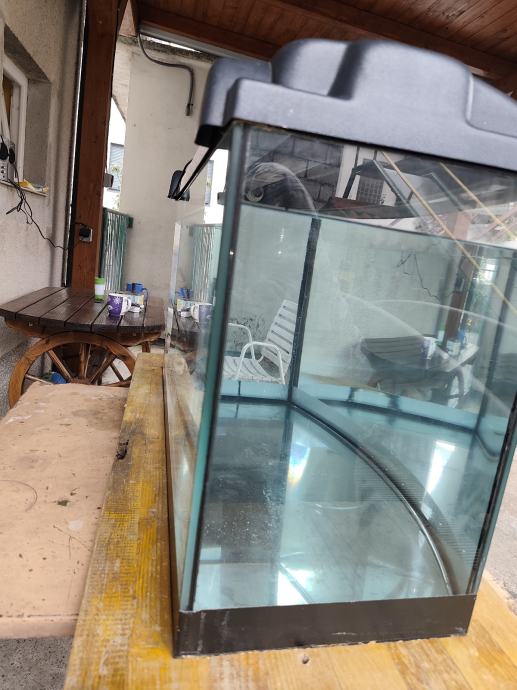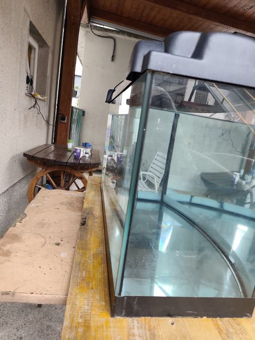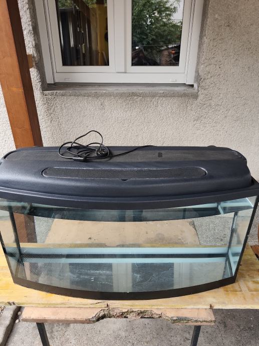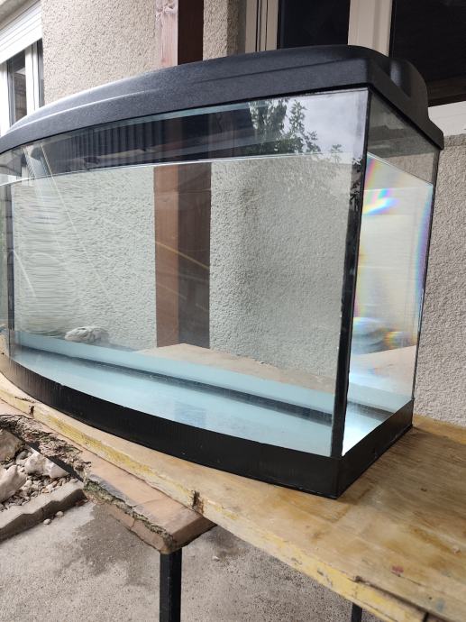 Akvarij zaobljeni 200 litara, pumpa vanjska Fluwal 204,filter keramika, spužva, led rasvjeta, pijesak za podlogu. Sve ispravno, akvarij ne curi, vidi se na slikama.Dimenzije