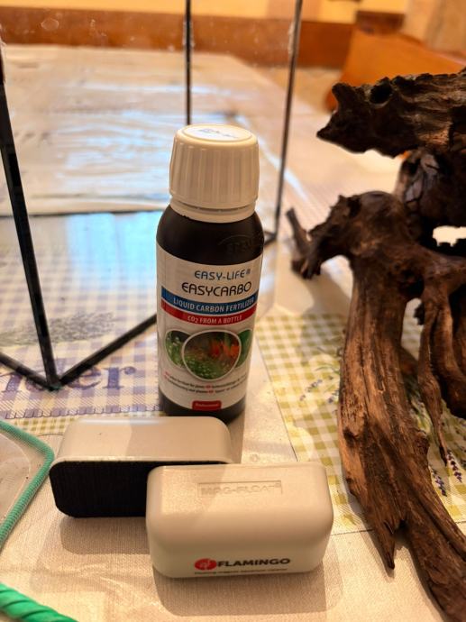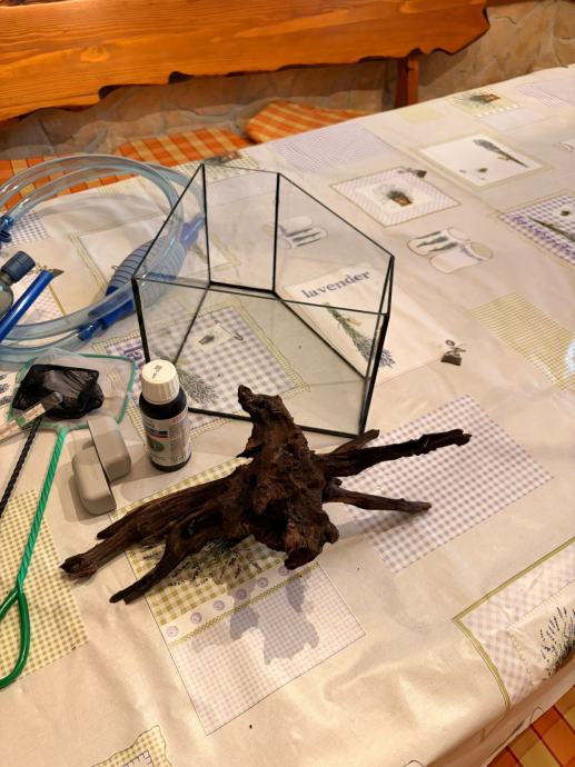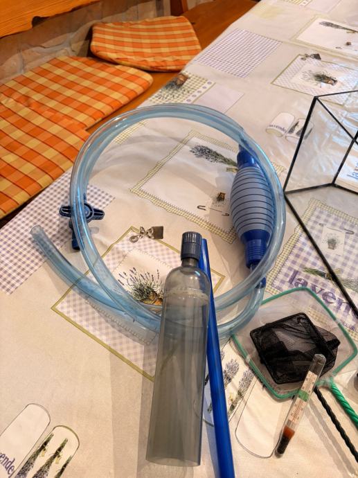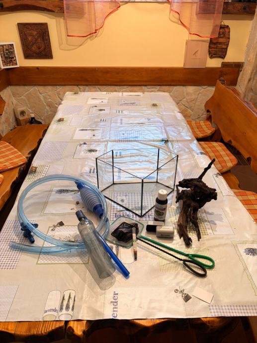Prodajem akvarijsku opremu sačinjenu od; jednog malog akvarija, ukrasnog panja za dno akvarija, tekućine za povećanje udjela CO2 u akvariju, magneta za čišćenje stakla akvarija, termometra za mjerenje temperature vode, dviju mrežica za hvatanje ribica i prljavštine s površine vode te seta za ,,usisavanje" dna akvarija. Cijeli komplet prodajem za 20€.