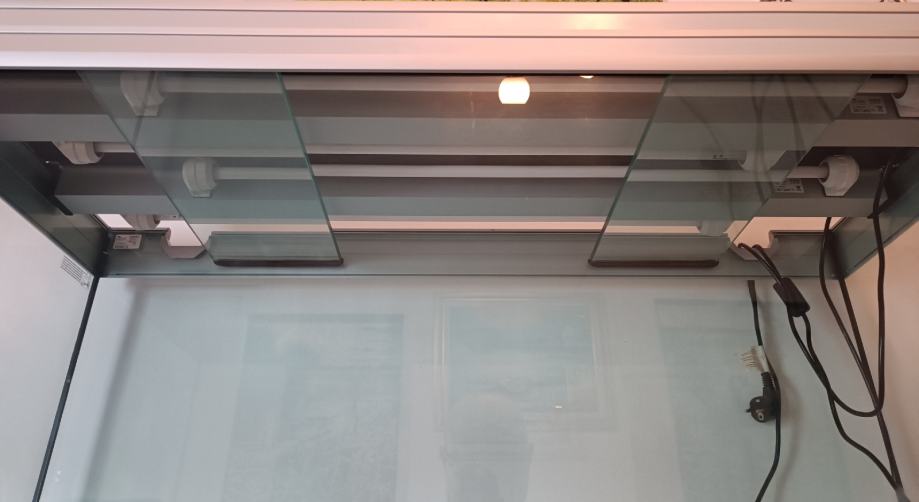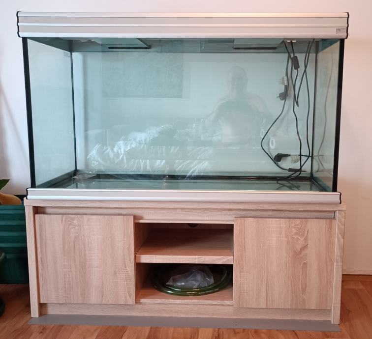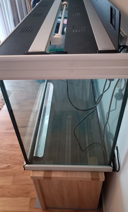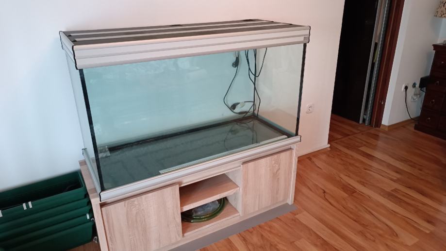 Aquarij je sa original lijepim aluminijskim dekorativnim poklopcem, 4 ugrađene lampe te pripadajućim cijevima. Sa aquarijem dajem filter /AHEIM Professional 250 / također nikada korišten te novo postolje (ormarić) posebno iznutra ojačan radi velikog tereta.