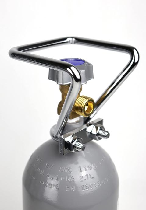Robusna ali praktična cilindrična boca od čelika s rotirajućim ventilom i ručkom za nošenje.