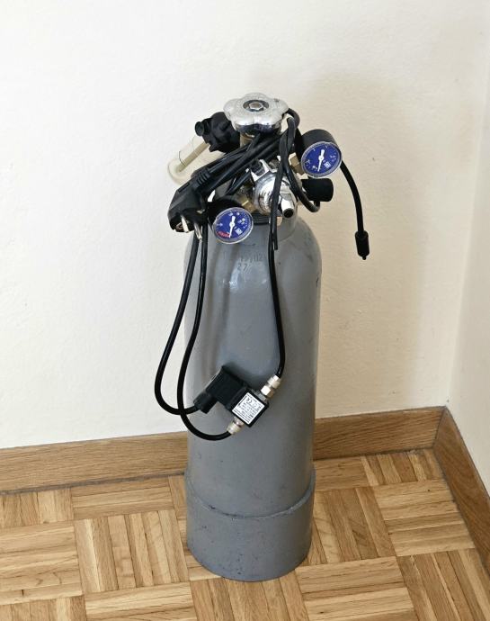 Prodajem CO2 komplet kao na slici (boca, redukcijski ventil, mjerač protoka). Boca je upravo napunjena. Sve radi.