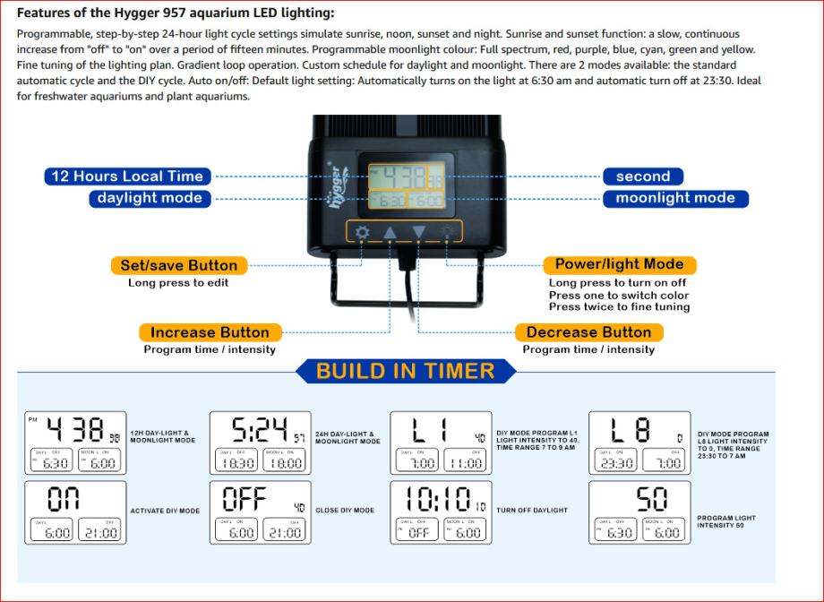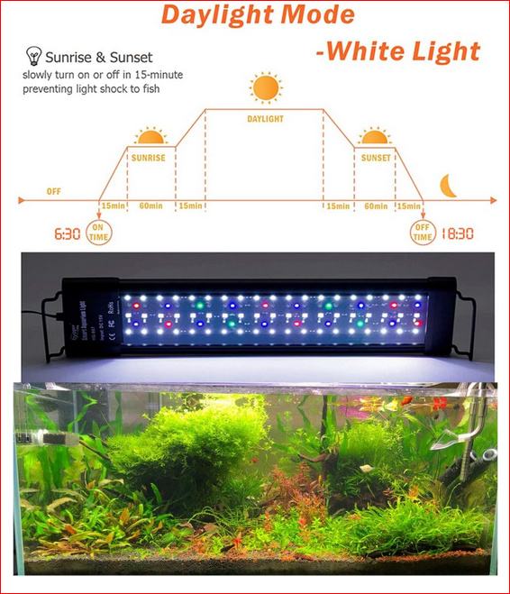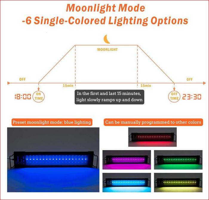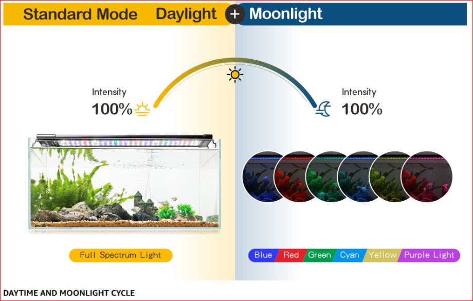 Funkcije izlaska i zalaska sunca: omogućuju jednostavno programiranje LED dioda tako da se polako pale ili gase unutar 15 minuta, izbjegavajući lagani šok za ribu. Način bijelog dnevnog svjetla miješa bijele, crvene, zelene i plave LED diode zajedno kako bi stvorio jarko svjetlo. Mjesečev način rada nudi 6 jednobojnih opcija i 10 razina zatamnjenja. 1 programibilna pretpostavka može pohraniti pojedinačne kombinacije boja i osvjetljenja.