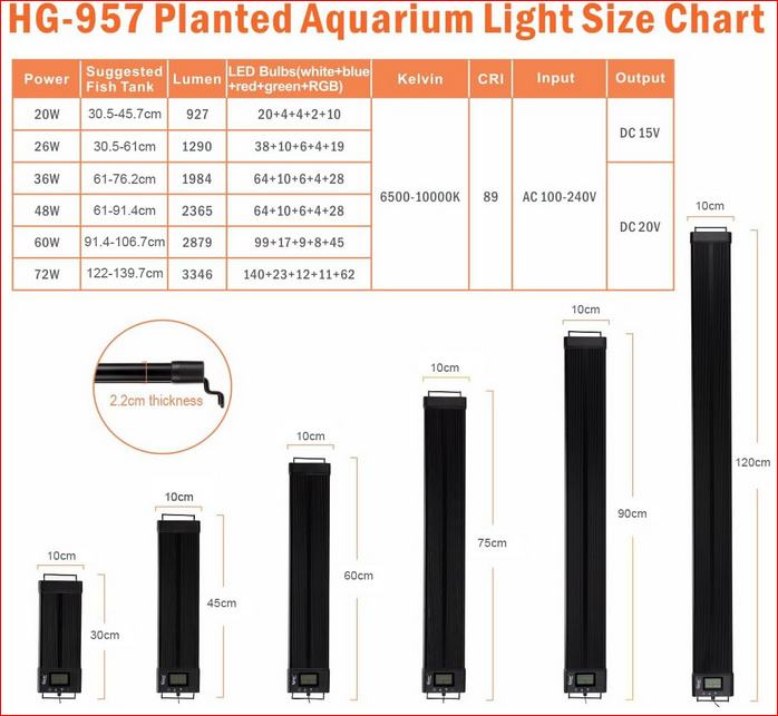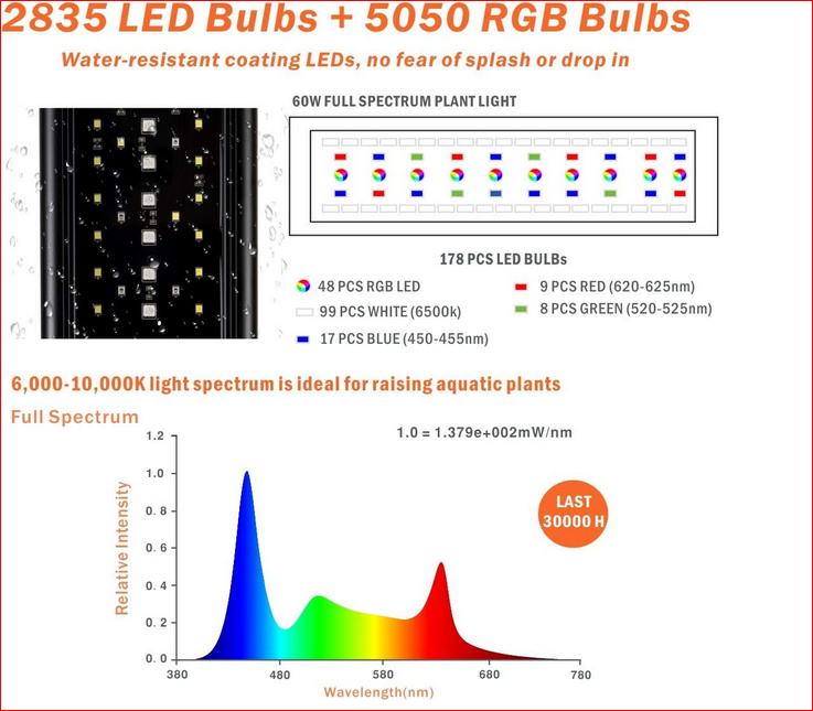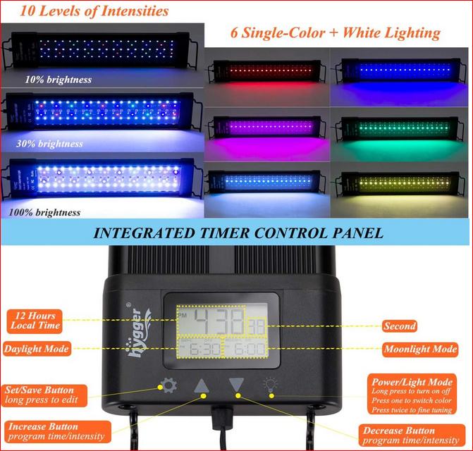 Svjetlo visoke kvalitete: boja svjetla za akvarij je čista optička, tamnoplava, zelena, ljubičasta, svijetloplava, žuta, crvena, tamnocrvena (znak početnog načina ciklusa boja). Svjetlo je mekano, indeks reprodukcije boja je blizu prirodnog svjetla, do 89%, štiti oči i ribe. Korištenje visokokvalitetnih kuglica lampe modela 2835 + 5050, dug životni vijek, najmanje 50 000 sati. Postoji 10 vrsta svjetline koje je moguće podesiti.