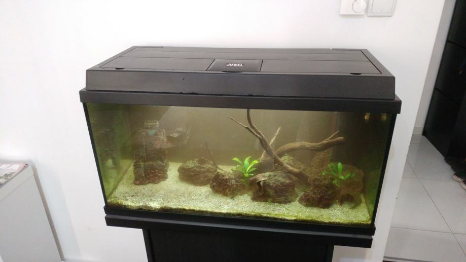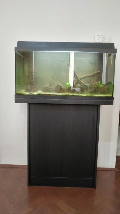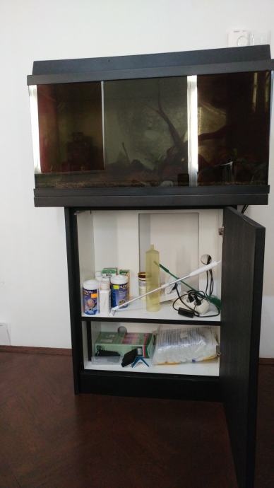 Prodajem akvarij sa ručno rađenim ormarićem ,svom opremom za čišćenje šljunak, vulkansko kamenje, ukrasne grane, 2 anubiusa, dvorac ukrasni.