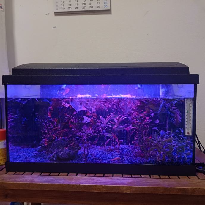Prodajem kompletan akvarij dimenzija 60 × 30 × 20 cm s poklopcem i LED rasvjetom (crveno/plavo svjetlo).