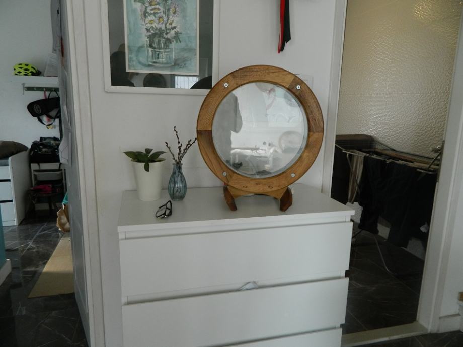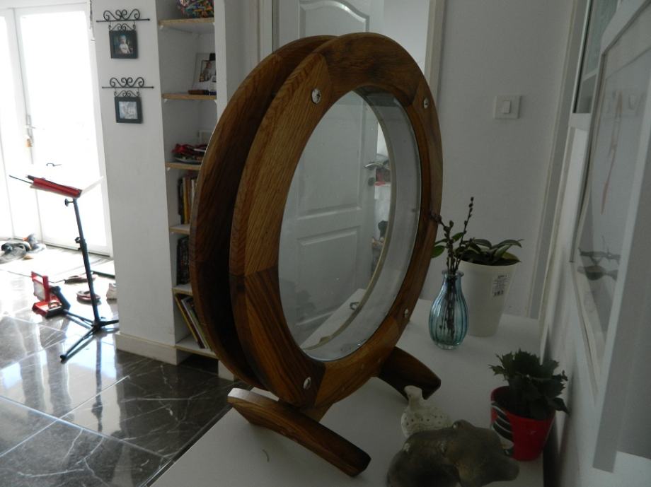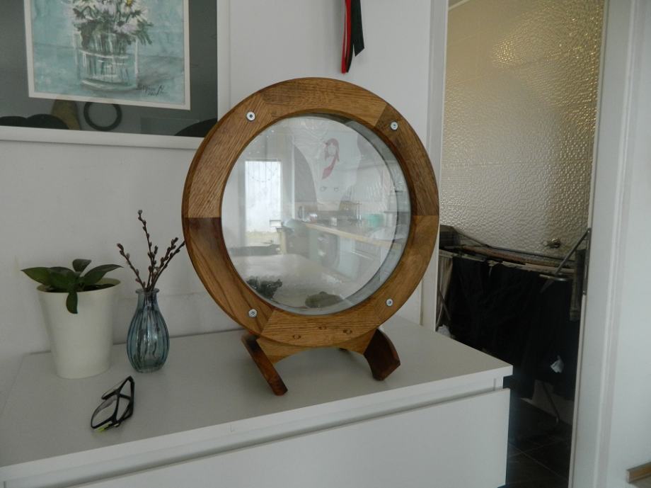 Prodajem mini akvarij bez ribica,44 cm promjer drvenog okvira ,staklo je promjera 34cm unutarnje širine 4 cm (između stakla)