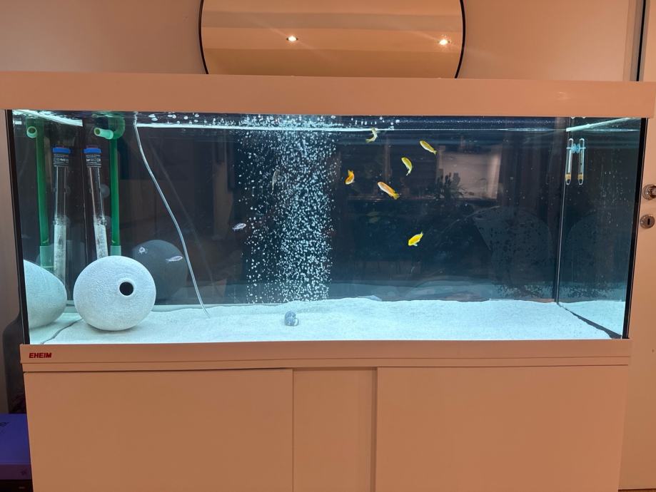 Prodajem Eheim 400litara, sa original pumpom i potpuno novim materijalima za filter i rezervnim materijalima, sa svom dodatnom opremom (automatska hranilica, pumpa za zrak, spuzve, mrezice, hrana, dozator za kemikalije i kemikalije za god dana, grijač i postolje) unutra je 9 malih ciklida. Potpuno je ocisceno i tek pokrenuto kao na slici. Prodajem radi preseljenja u drugi stan.