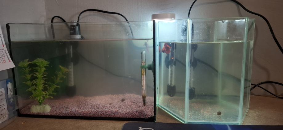 Prodajem 2 akvarija s grijačem 25W ili mijenjam za jedan malo veći akvarij.