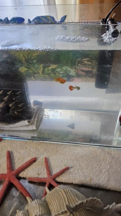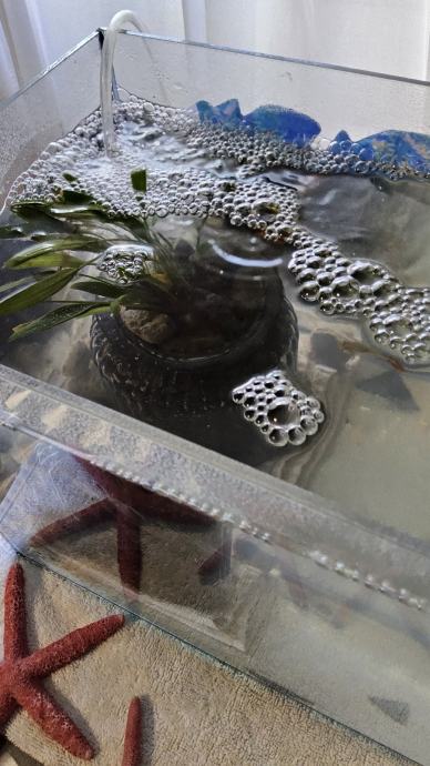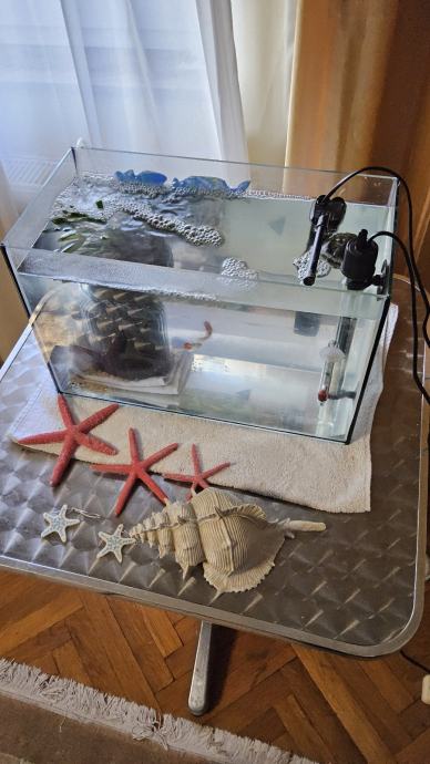 akvariji, grijac, pumpa zraka, filter aktivni, decoracije, cvijece i mrezom.