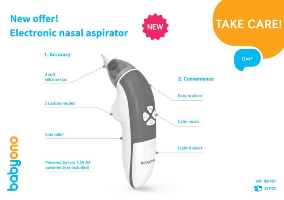 Aspirator je namijenjen za malu djecu i bebe. Ima snažnu, ali sigurnu snagu usisavanja za uklanjanje nazalnog isjetka, kako bi beba mogla slobodnije i jednostavnije disati. Aspirator na baterije temeljit je u čišćenju bebinog začepljenog nosa bez stvaranja iritacije nosne sluznice. Radi tihog djelovanja može se koristit čak i kada beba spava. Kako biste sebi olakšali zadatak, bebu možete odvratiti puštanjem umirujuće melodije na samom aspiratoru. Njegova lagana konstrukcija i ergonomski oblik čine aspirator vrlo jednostavnim za korištenje tijekom putovanja.
