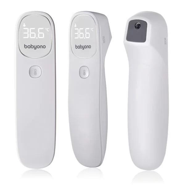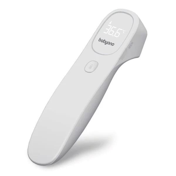 Babyono beskontaktni toplomjer model JXB-311. Medicinska komponenta. Usmjeravanjem toplomjera prema čelu možete brzo i točno izmjeriti temperaturu, lakše i praktičnije za korištenje od tradicionalnih oralnih, ručnih, rektalnih ili ušnih termometara. Pritiskom na gumb možete dobiti točna očitanja u 1 sekundi. Termometar također mjeri temperaturu predmeta, hrane, tekućina i okoline. Tihi i jedinstveni vibrirajući alarm omogućuje mjerenje temperature dok beba spava. Moderan LED zaslon s pozadinskim osvjetljenjem omogućuje vam jednostavno očitavanje temperature čak i noću. Medicinski proizvod, klinički ispitan u EU.