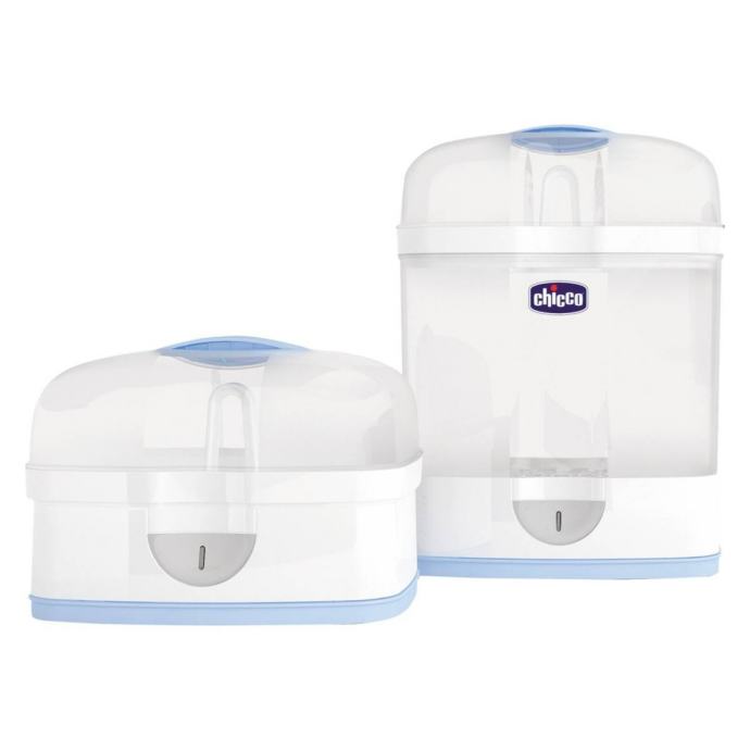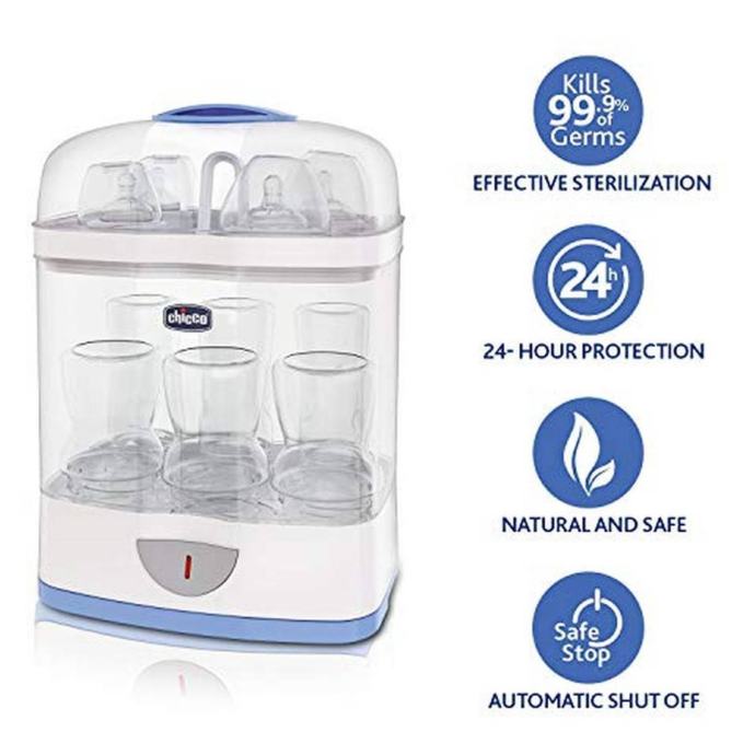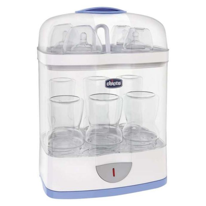 Električni parni sterilizator Chicco Sterile Natural sterilizira do 6 dječjih bočica, 1 pumpicu za dojke i druge sitnice poput duda u samo 5 minuta.