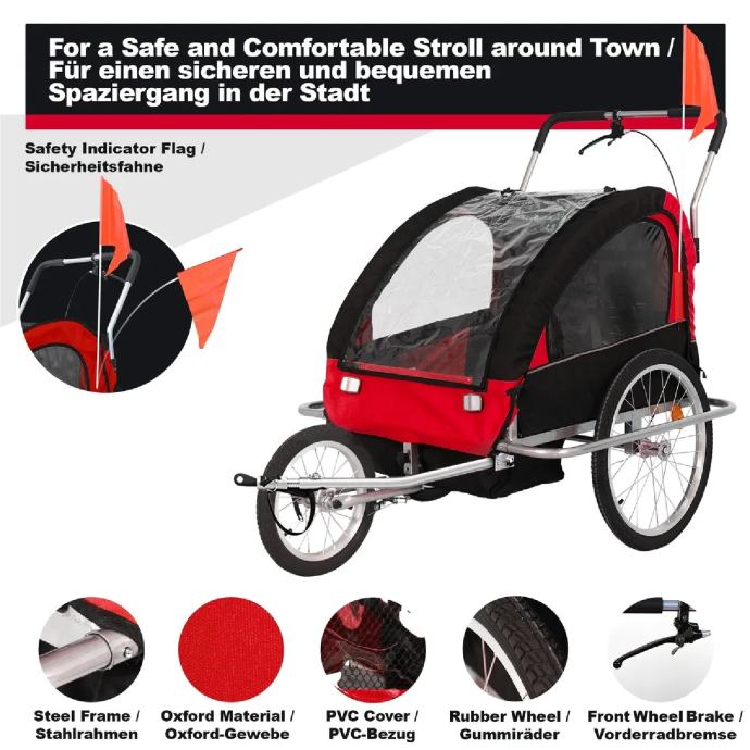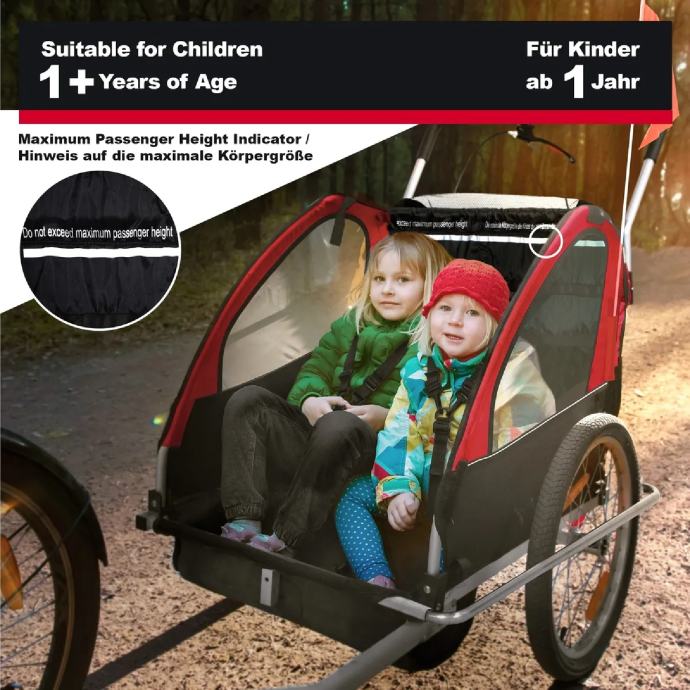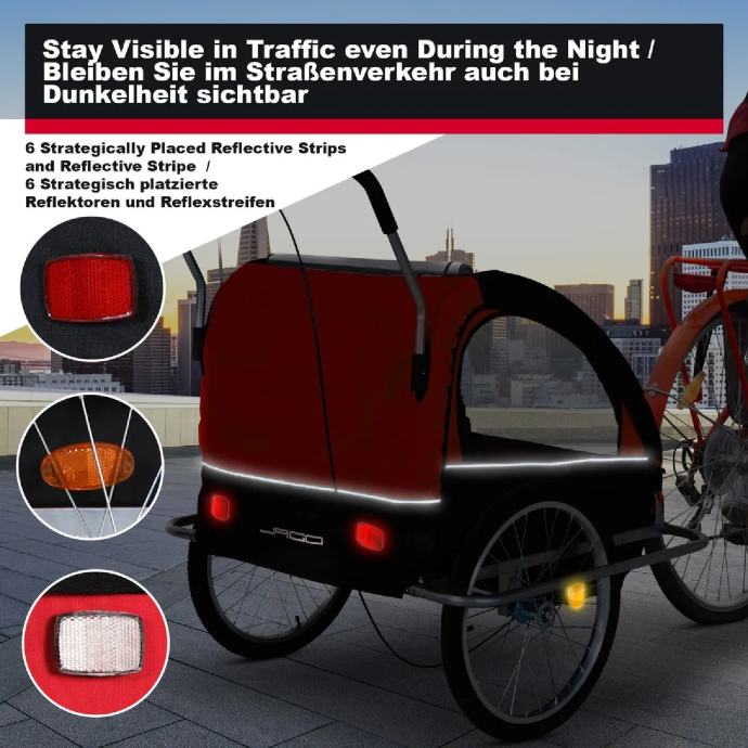 Posjeduju rudo za bicikl,ceradu protiv svih vremenskih uvjeta i sigurnosnu kočnicu.