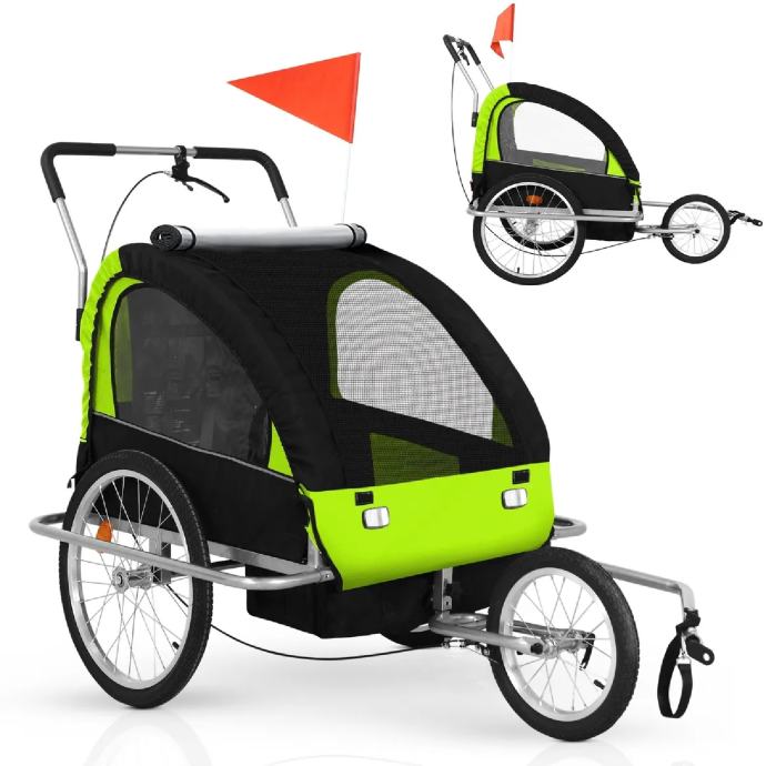 Dječija kolica za bicikli i guranje u crvenoj, zelenoj i plavoj boji