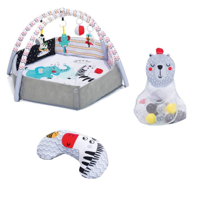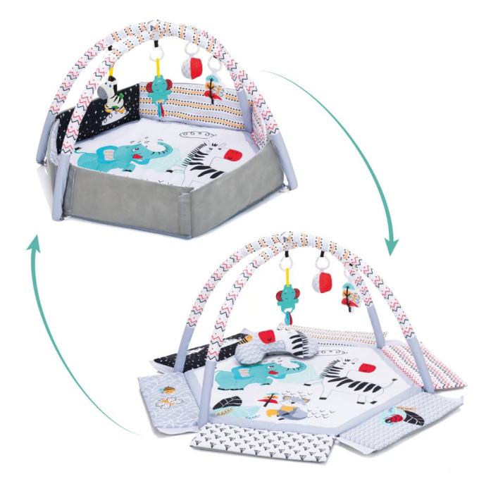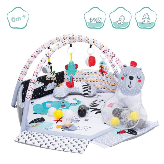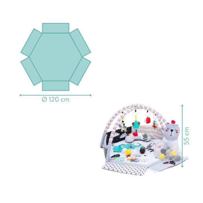 Edukativna igraonica za bebe Colourful nudi brojne funkcije. Može se koristiti kao prostirka za igru ili puzanje te pruža savršeno okruženje za igru zahvaljujući mekom punjenju i simpatičnom, šarenom uzorku. Ako je vaša beba još uvijek premala za puzanje, može se igrati ležeći na leđima uz različite igračke koje vise s lukova za igru. U kompletu se nalaze zvečke, grickalice i druge igračke koje potiču koordinaciju i drže dijete zaokupljenim. Posebna atrakcija su uključene loptice koje će sigurno razveseliti vaše dijete, a podignuti rubovi sprječavaju njihovo kotrljanje po kući tijekom igre. Kada loptice nisu u upotrebi, mogu se spremiti u priloženu torbu.