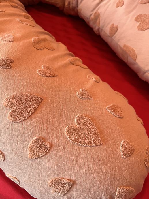 Uživo je boja nježna breskva roza, vrlo topla i umirujuća. Jastuk je višenamjenski – tijekom trudnoće pruža oslonac trbuhu, leđima ili zdjelici, a kasnije olakšava dojenje ili hranjenje, služi za bebin odmor te kao potpora pri prvim pokušajima sjedenja.