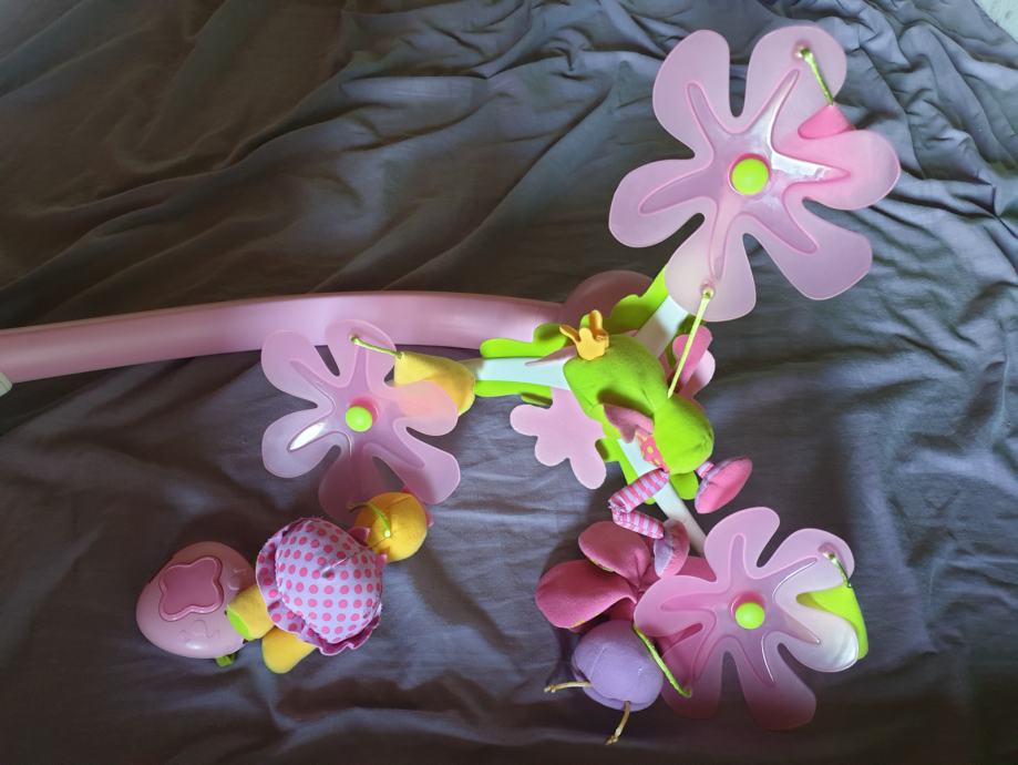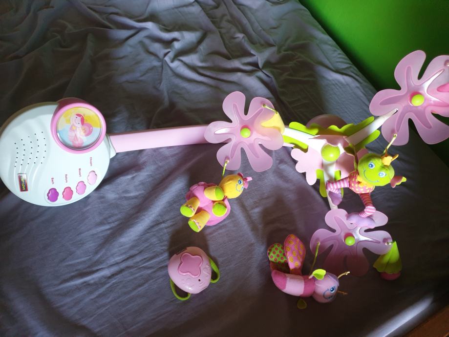 Sve je funkcionalno, neoštećeno, rabljeno, na baterije, uz ekstra daljinski koji služi da ponovno pokrene vrtuljak koji se automatski gasi nakon određenog vremena.