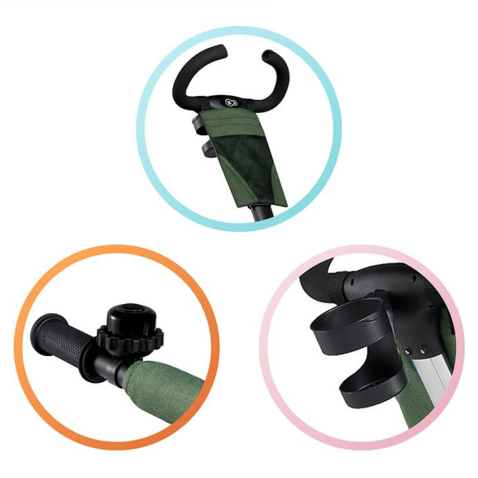 – verziju s zaštitnom ogradom i sigurnosnim pojasom uklonjenim za stariju djecu (roditelj i dalje može imati kontrolu pomoću ručke),