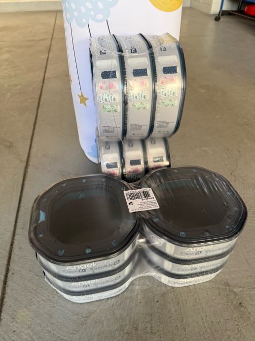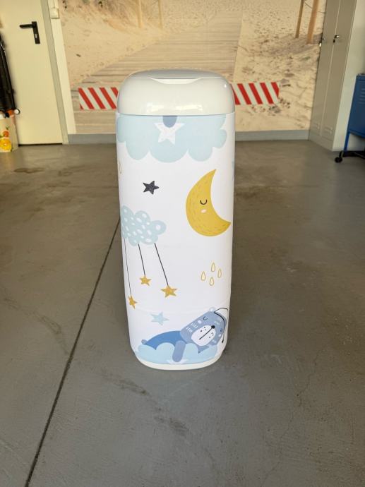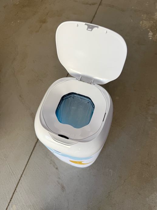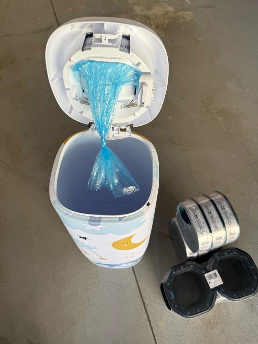 Koš za pelene sa dodatnih 13 kazeta s vrečicama za pelene. U košu se nalazi integrirani nož s kojim se režu pune vrečice i izvlače nove. Vrlo praktično, kupljeno u njemačkoj. Stanje kao novo.