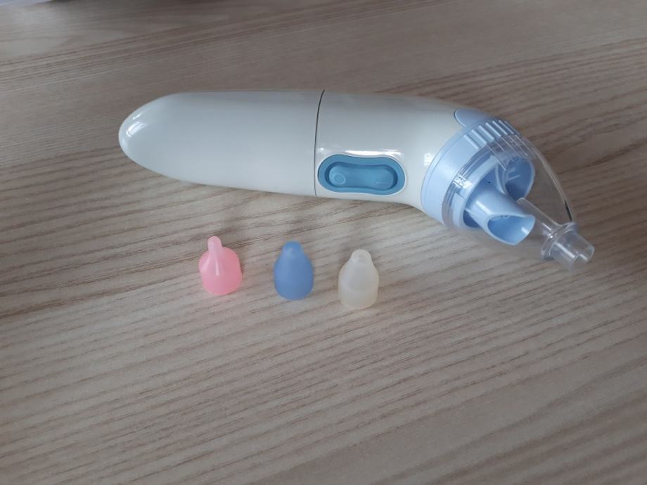Jako malo korišten aspirator za nos, radi na dvije baterije. Pogodan za skroz male bebe. Ima 3 nastavka i svoju torbicu za pohranu.