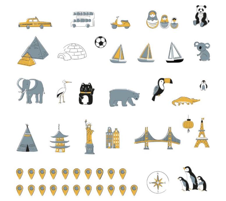Ovaj set uključuje: kontinente, otoke i dodatne (edukativne) elemente.
