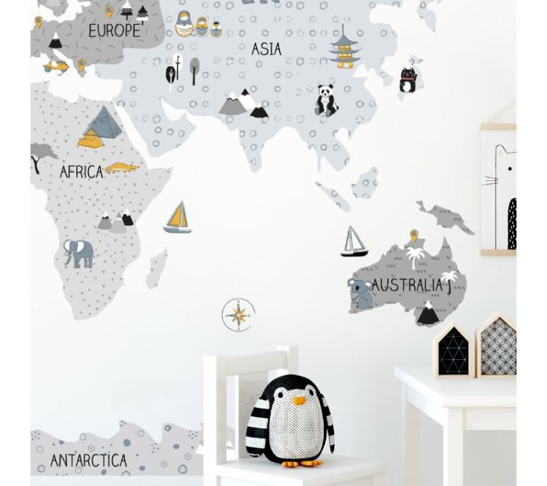 Karte nisu samo jedinstveni ukras, već i senzacionalan način učenja kroz igru. Djeca uče o kontinentima, oceanima i smjerovima svijeta, kao io spomenicima i atrakcijama određene regije ili države. Zahvaljujući posebnim dodatnim naljepnicama, mogu označiti i mjesta koja su već posjetili ili koja bi željeli posjetiti u budućnosti.