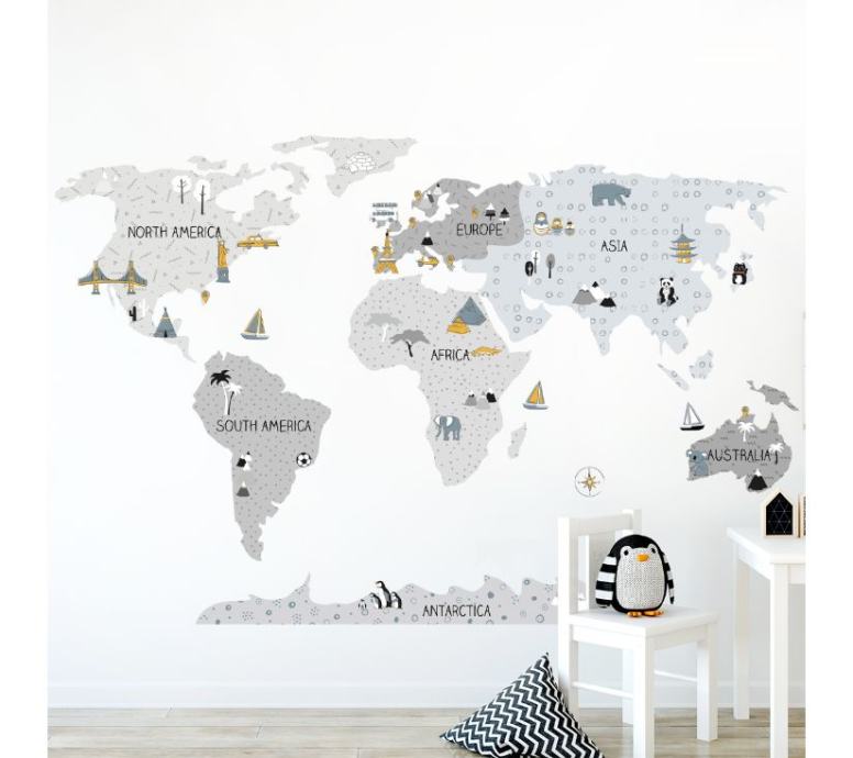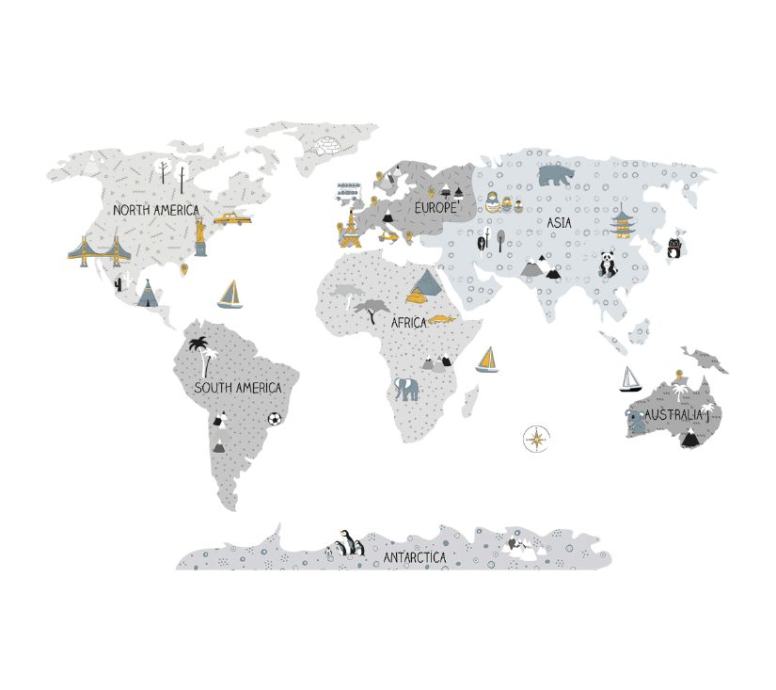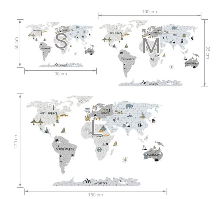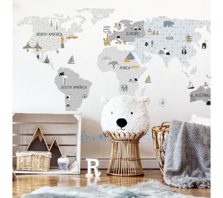 Karte nisu samo jedinstveni ukras, već i senzacionalan način učenja kroz igru. Djeca uče o kontinentima, oceanima i smjerovima svijeta, kao io spomenicima i atrakcijama određene regije ili države. Zahvaljujući posebnim dodatnim naljepnicama, mogu označiti i mjesta koja su već posjetili ili koja bi željeli posjetiti u budućnosti.