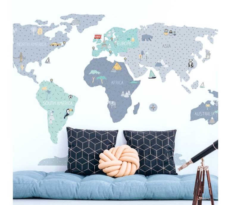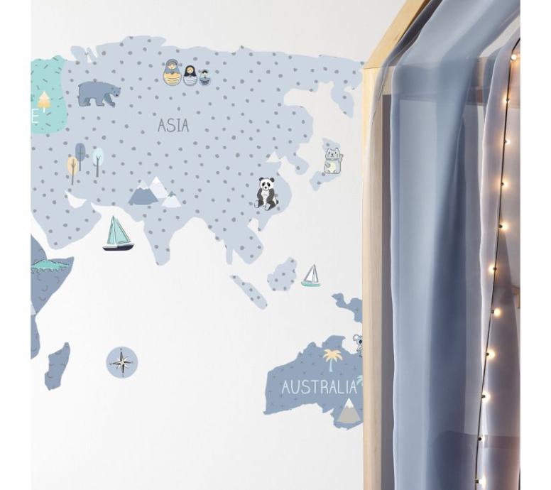 Karte nisu samo jedinstveni ukras, već i senzacionalan način učenja kroz igru. Djeca uče o kontinentima, oceanima i smjerovima svijeta, kao io spomenicima i atrakcijama određene regije ili države. Zahvaljujući posebnim dodatnim naljepnicama, mogu označiti i mjesta koja su već posjetili ili koja bi željeli posjetiti u budućnosti.