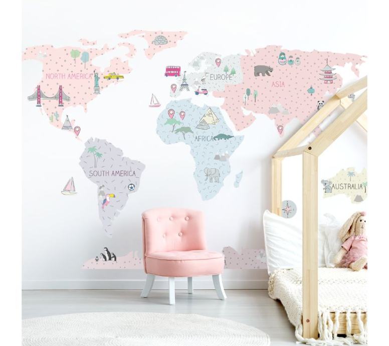 Karte nisu samo jedinstveni ukras, već i senzacionalan način učenja kroz igru. Djeca uče o kontinentima, oceanima i smjerovima svijeta, kao io spomenicima i atrakcijama određene regije ili države. Zahvaljujući posebnim dodatnim naljepnicama, mogu označiti i mjesta koja su već posjetili ili koja bi željeli posjetiti u budućnosti.