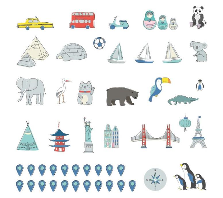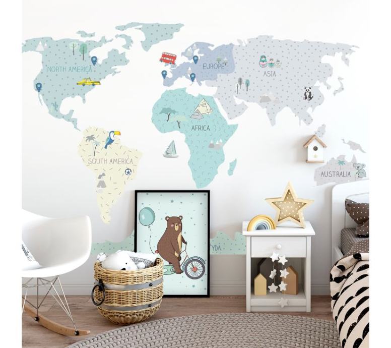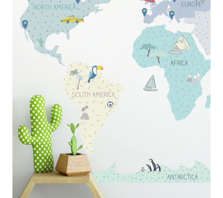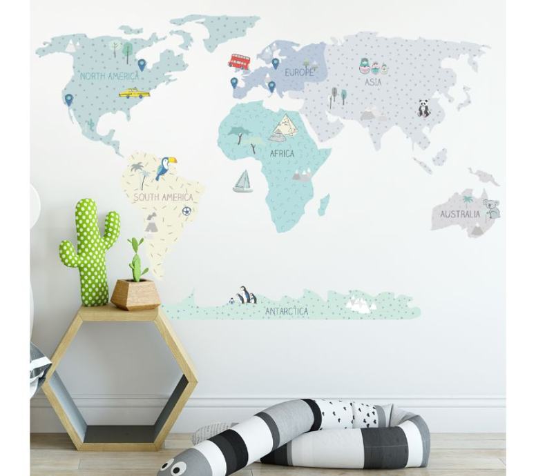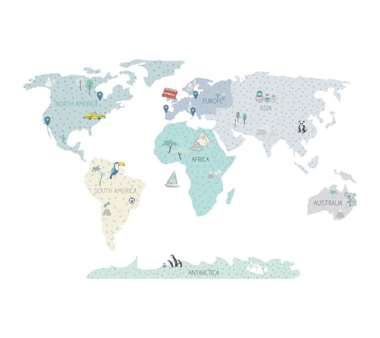 Karte nisu samo jedinstveni ukras, već i senzacionalan način učenja kroz igru. Djeca uče o kontinentima, oceanima i smjerovima svijeta, kao io spomenicima i atrakcijama određene regije ili države. Zahvaljujući posebnim dodatnim naljepnicama, mogu označiti i mjesta koja su već posjetili ili koja bi željeli posjetiti u budućnosti.