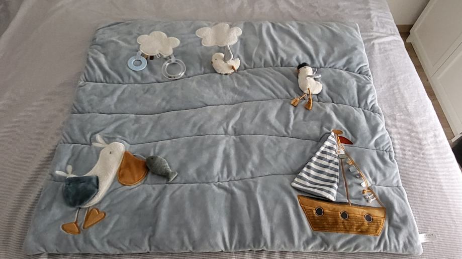 Prodajem podlogu za igru za bebe brenda Little Dutch, dimenzije 80×100cm. Podloga je kratko korištena. Stanje je kao novo. Iznimno je ugodnog materijala. Na podlozi se nalazi galeb koji svira kada ga se stisne, pelikan koji u kljunu ima sakrivenu ribu. Jedan od oblaka ima prsten koji zvecka, a jedrilica krije malo zrcalo.