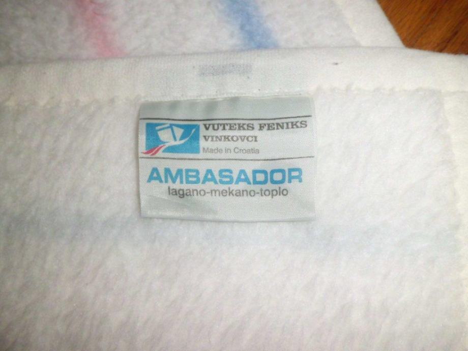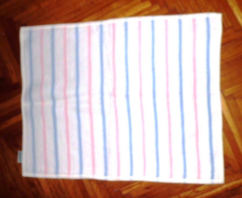Bijela dekica za bebe sa rozim i plavim prugama Ambasador. Proizvođač Vuteks Feniks Vinkovci. Dimenzije 100x80 cm. Pogodna za krevetić ili za kolica.