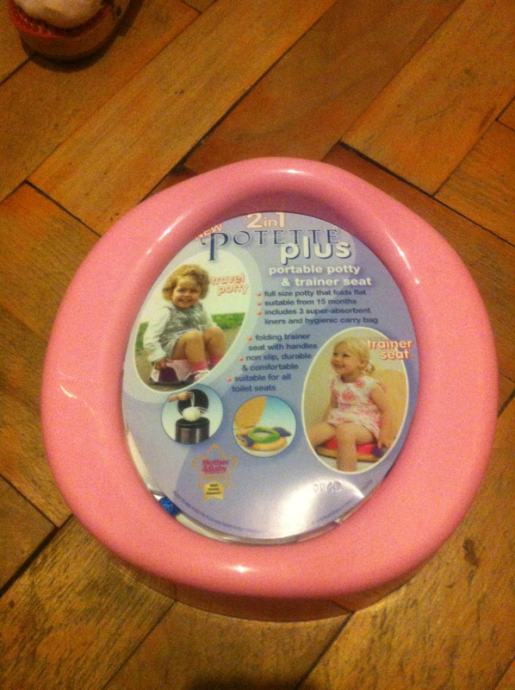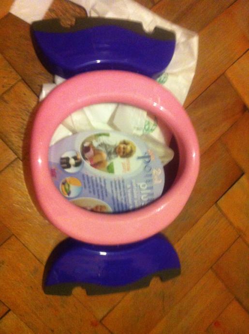 Roza, nekoristena. Sa 2 gratis vrecice i prijenosna vrecica.Genijalan izum, moze se koristiti kao tuta i kao sjedalo za wc. cijena bila 200kn