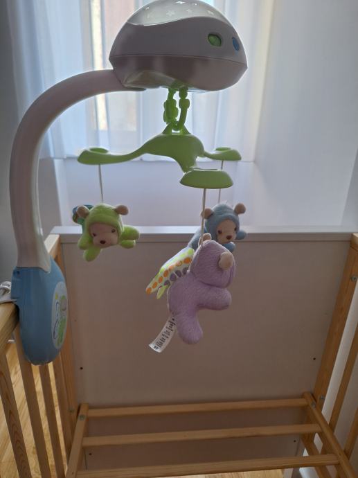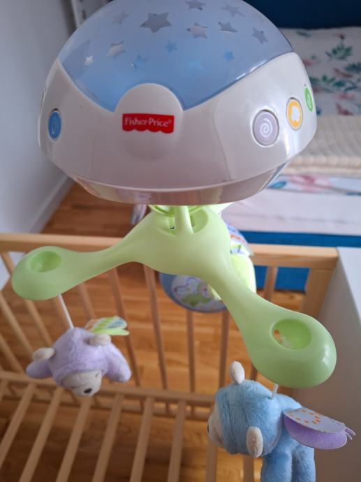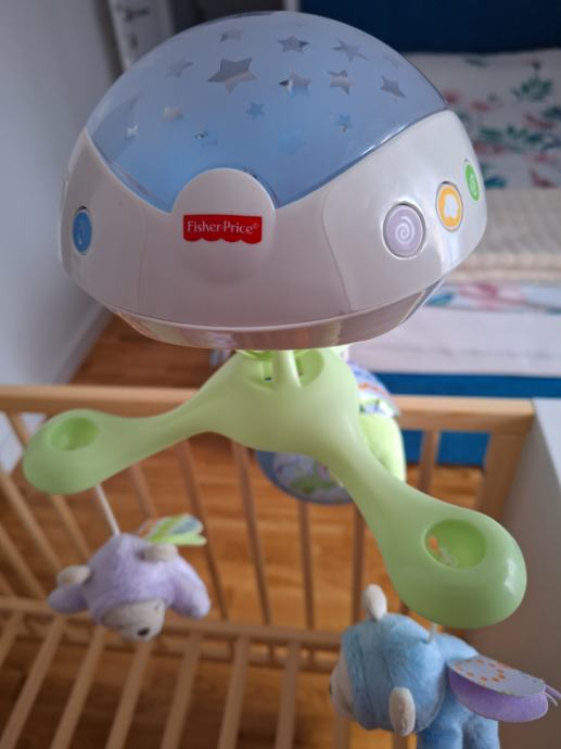 Fisher Price 3u1 projektor pomoći će vam u uspavljivanju vaše bebe. Ovaj prekrasan projektor sadrži tri različite melodije: uspavanku, bijeli šum i zvukove prirode; koje sviraju do 30 minuta i koje će pomoći umiriti svaku bebu. Zvjezdice koje se projiciraju i leteći medvjedići koji se vrte zaokupit će pažnju mališanima. Kako vaša beba raste, projektor možete odvojiti od vrtuljka, te ga samostalno postaviti na noćni ormarić, kako bi i dalje pomoću svjetla i glazbe pomogao u uspavljivanju bebe. Vrtuljak se pomoću kukice jednostavno spaja na kolica, kako bi se beba mogla igrati s medvjedićima i dok je u šetnji.
