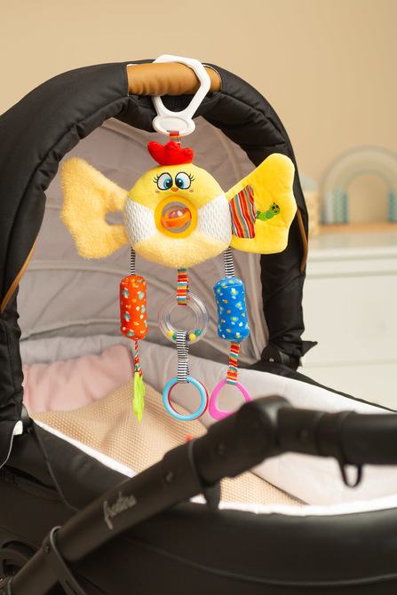 Zahvaljujući univerzalnom pričvršćivanju, igračka se može lako montirati ne samo na krevetić, već i na kolica i autosjedalicu, pružajući djetetu zabavu tijekom putovanja ili šetnje.