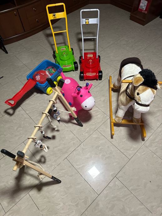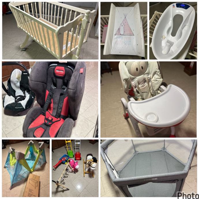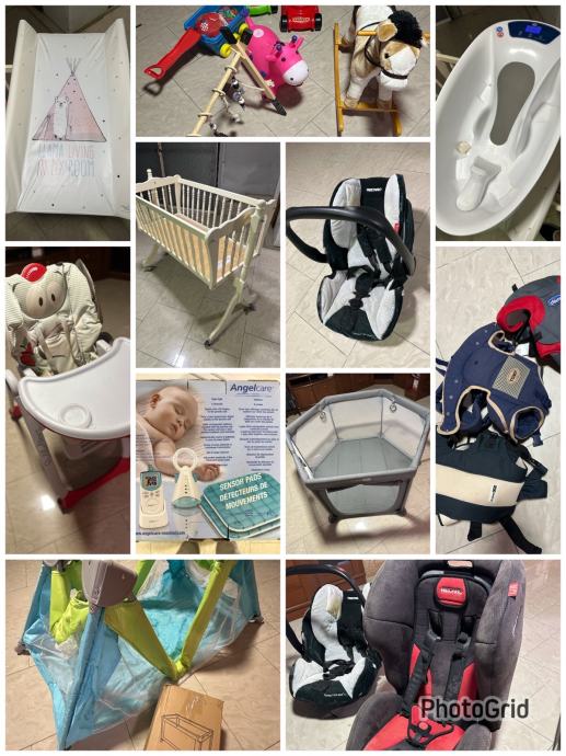 Kolijevka dimenzija 95x52 sa madracem, podloga za prematanje 80x50, Aquascale kadica za kupanje sa vagom, Recaro auto sjedalica i Recaro nosiljka sa isofix bazom za auto, sklopiva Chicco hranilica, prijenosni kinderbet, Angelcare monitor za zvuk, 3 nosiljke za prsa različitih veličina, vrtić za bebu, na poklon konjic i neke igracke te Bestway dječji bazen 274x198x137.