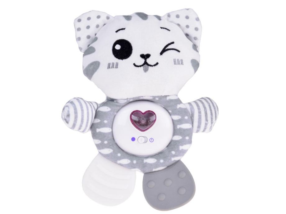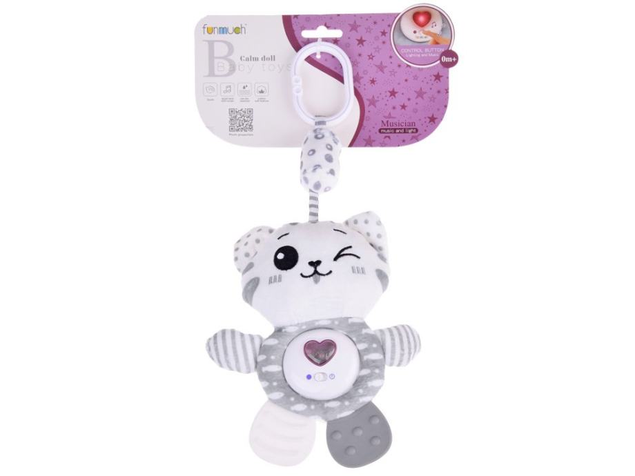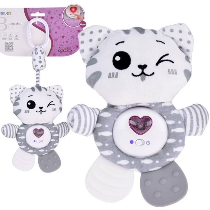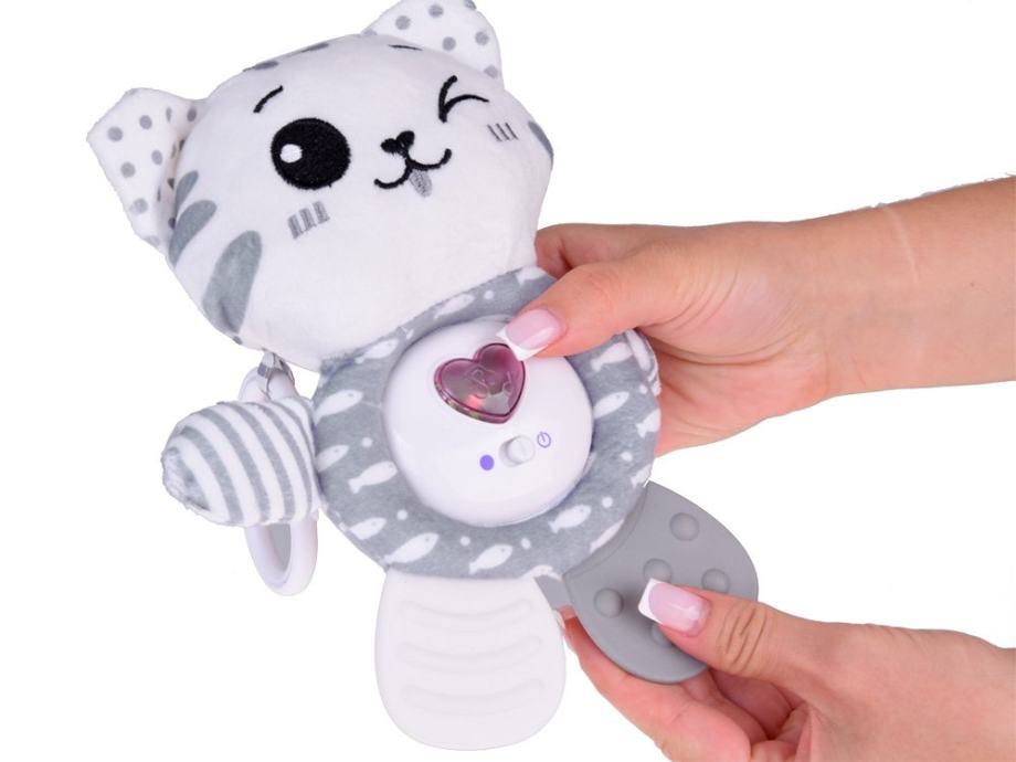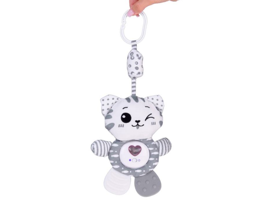 Plišana mačka kombinacija je šuškalice, grickalice i zvučnog privjeska. Savršeno ispunjava sve funkcije zahvaljujući različitim materijalima od kojih je izrađen. Privjesak je idealan za korištenje u dječjem krevetiću, tijekom šetnje kolicima i tijekom senzorne igre za dojenčad.