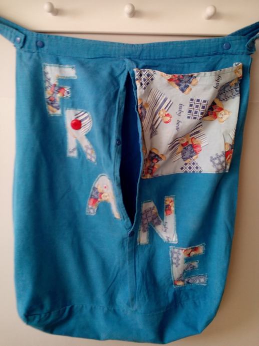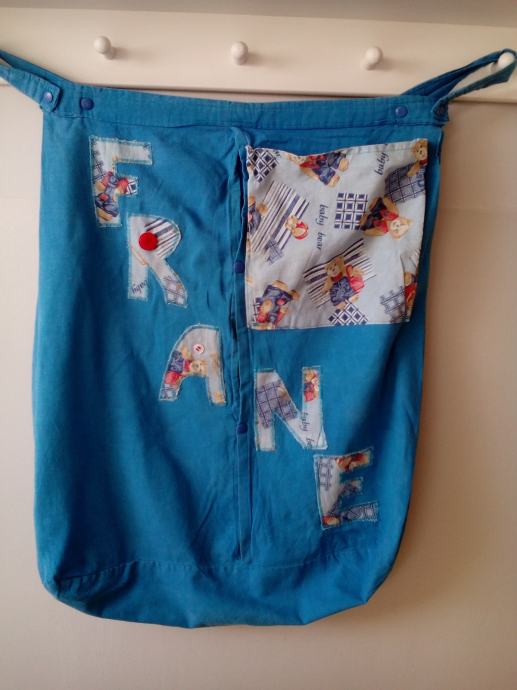 Torba za pelene-kolica, naručena sa izvezenim imenom Frane, ima mali dđepić izvana i dvije ručke koje se mogu staviti na kolica ili zakačiti na dječji krevetić, komodu za prematanje...gdje god vam je praktično i prilikom npr.odlaska na put samo ju otkačite i ponesete. Perivo u perilici na 60.