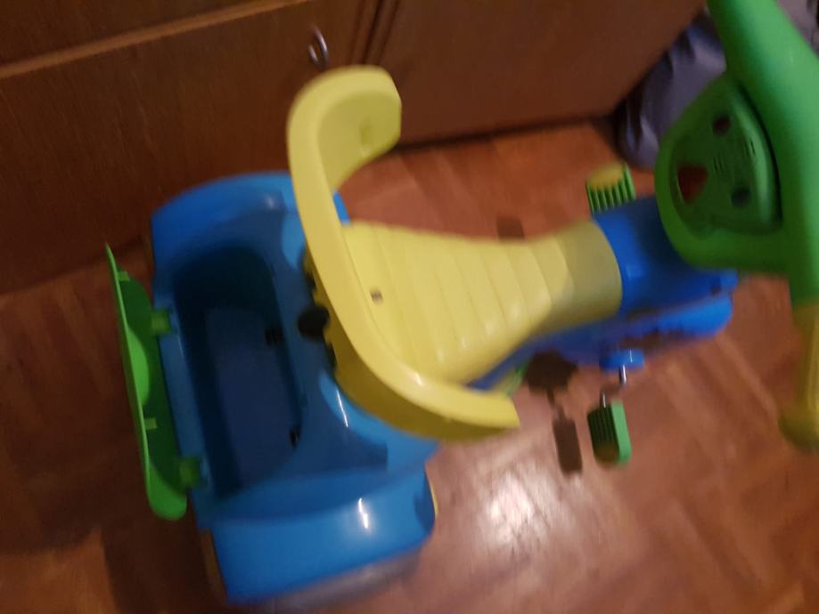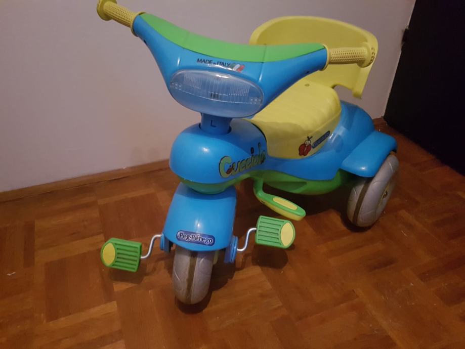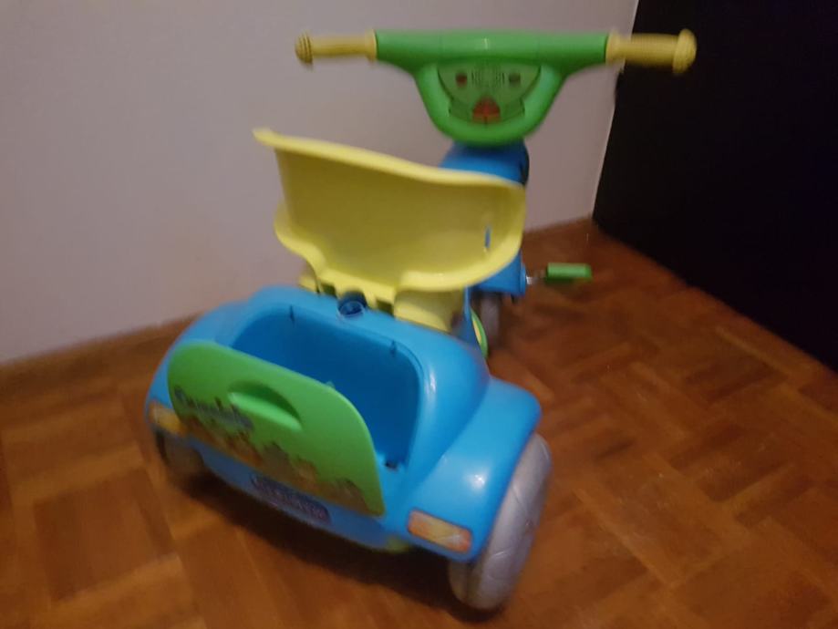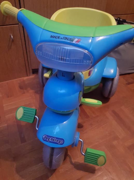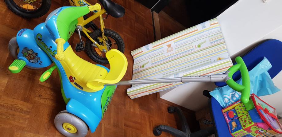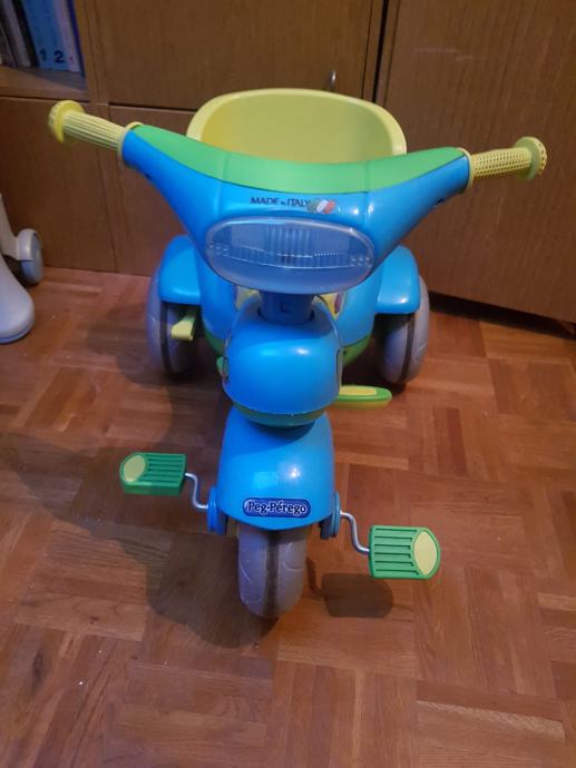 Tricikl za uzrast od 2-4 god. Ručka preko koje roditelj upravlja triciklom, podesiva u 5 položaja, mogućnost skidanja ručke. Posjeduje sigurnosni pojas na sjedištu. Dodatni držači za noge koji se mogu sklopiti kada dijete poraste. Pogon prednjeg kotača preko pedala. Prtljažnik sa poklopcem.