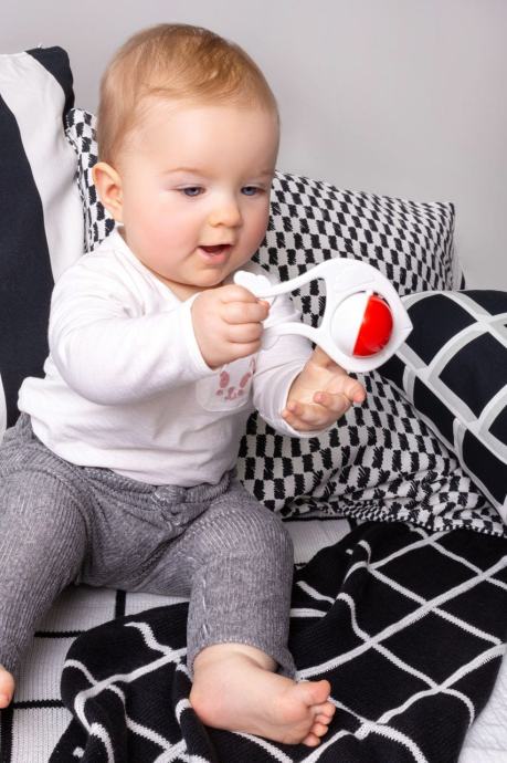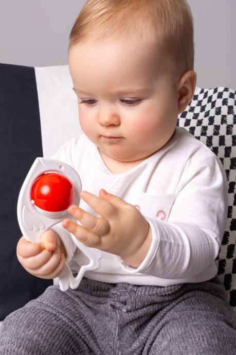 Prekrasna, klasična zvečka u obliku ribe. Savršeno stimulira bebin osjet sluha, vida i dodira.
