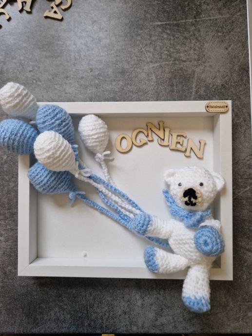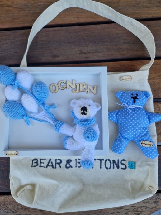 Prigodan poklon za novorođenče.Sastoji se od ručno heklanih motiva npr medvjedić slonić zec baloni...Drvena slova s imenom djeteta.Pamučna igračka za miran san jer je punjena lavandom I drugim ljekovitim biljem koje djeluje umirujuće I odbijaja insekte. Pripadajuća pamučna torba.