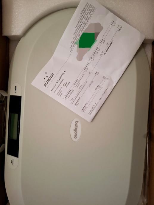 Vaga za bebe do 20 kg. Korištena povremeno kratko do bebinog drugog mjeseca života.
