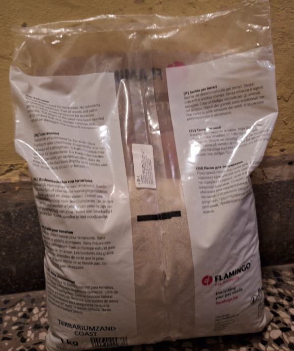 Pijesak je namijenjen za posebnu posudu u kavezu (pješčanu kupku koja hrčcima pomaže da se bolje očiste, istražuju novu površinu ,zabavno im je kopati u njoj, skrivati hranu te ponekad u njoj bave nuždu). Pješčana kupka važna je za svaku vrstu hrčka pogotovo roborovskog (kao najmanja i najbrža vrsta roborovski hrčak u prirodi živi u područjima pustinja i polupustinja, stoga je za njih pješčana kupka ekstremno važna te je preporuka da zauzima trećinu kaveza). Preporučujem da pijesak čistite ovisno o tome koliko često vaš hrčak u njemu bavi nuždu. U mom slučaju to je značilo svaka dva dana. Za tu svrhu možete nabaviti posebnu lopaticu za pijesak, ali bi vam i normalna cjediljka mogla poslužiti. Ja sam stari pijesak bacio svakih par mjeseci te onda zamijenio s novim. Vama preporučujem da ga potpuno zamijenite po potrebi. Ovaj pijesak originalno je namijenjen za reptile, ali je potpuno siguran za hrčke jer nema dodanog kalcija ili boja. (slika na kraju primjer je roborovskog hrčka u kutiji s pijeskom (pješčana kupka))