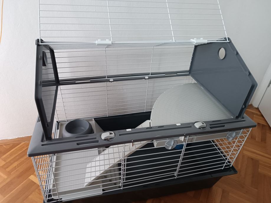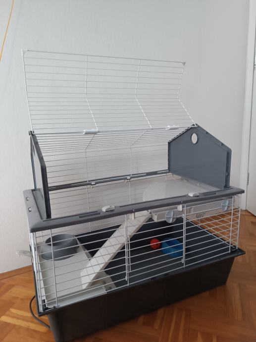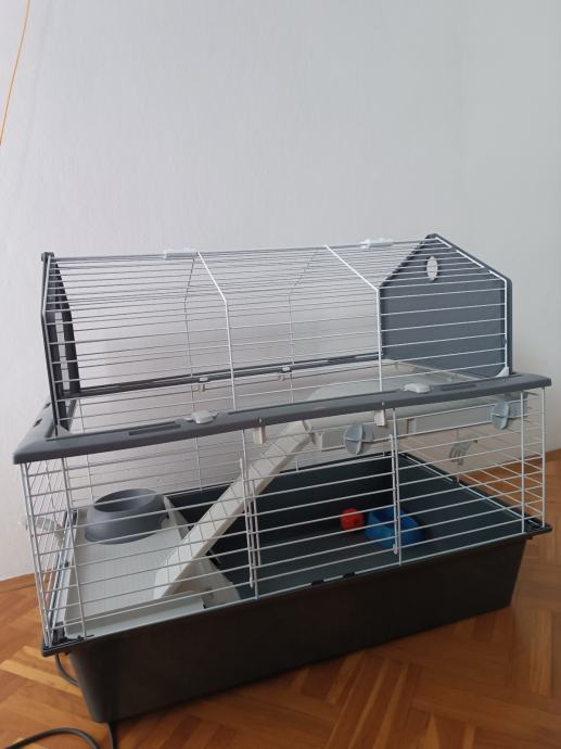 Prodaje se kavez sa grijačem kojeg je moguće odvojiti ukoliko nije potreban. Dužina 77cm, visina 66cm i širina 48cm. Uz njega dolaze i 2 posude za vodu i hranu te gumena lopta.